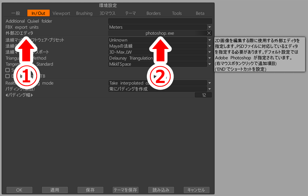 外部エディタ【下図①↓】は各自で設定できますので、私は【下図②↓】のようにPhotoshopを登録しています(デフォルトの外部エディタがPhotoshopとなっています)。