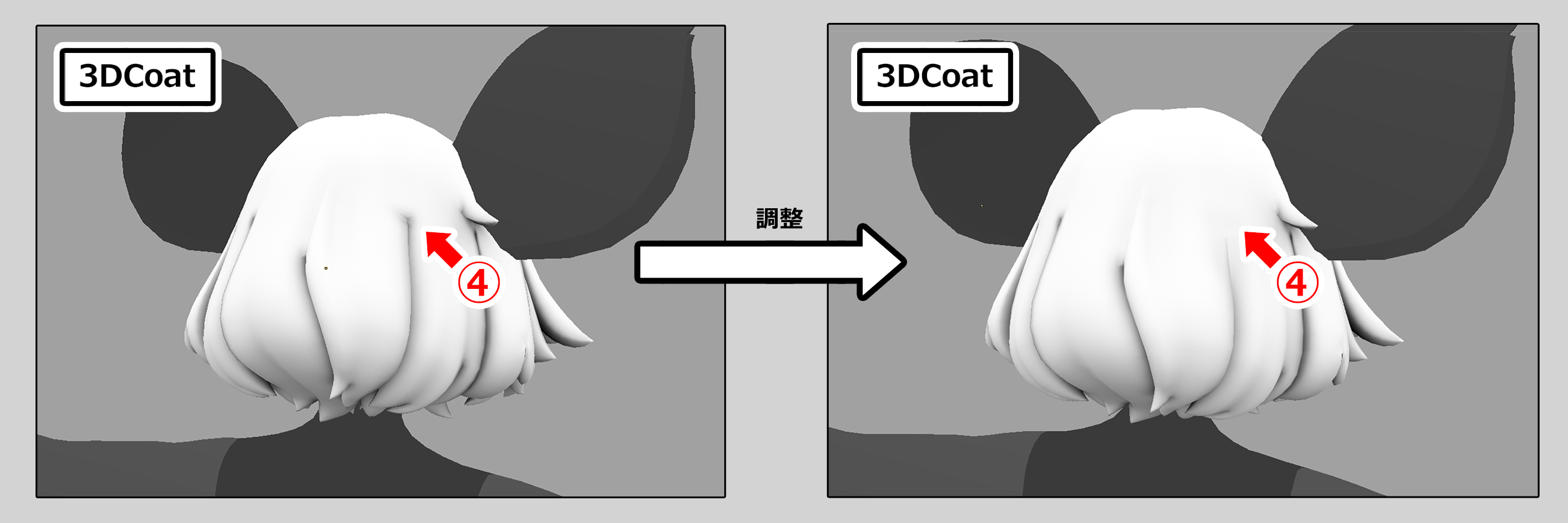 加筆が終了したら、Photoshopでctrl+Sで上書き保存し、3DCoatに戻ります【下図②↓】。すると、Photoshopの修正が3DCoat上に反映されているはずです。調整前と後を比べると、3DCoatで確認してもだいぶいい感じに直ったのがわかります。【下図③↓と④↓】。