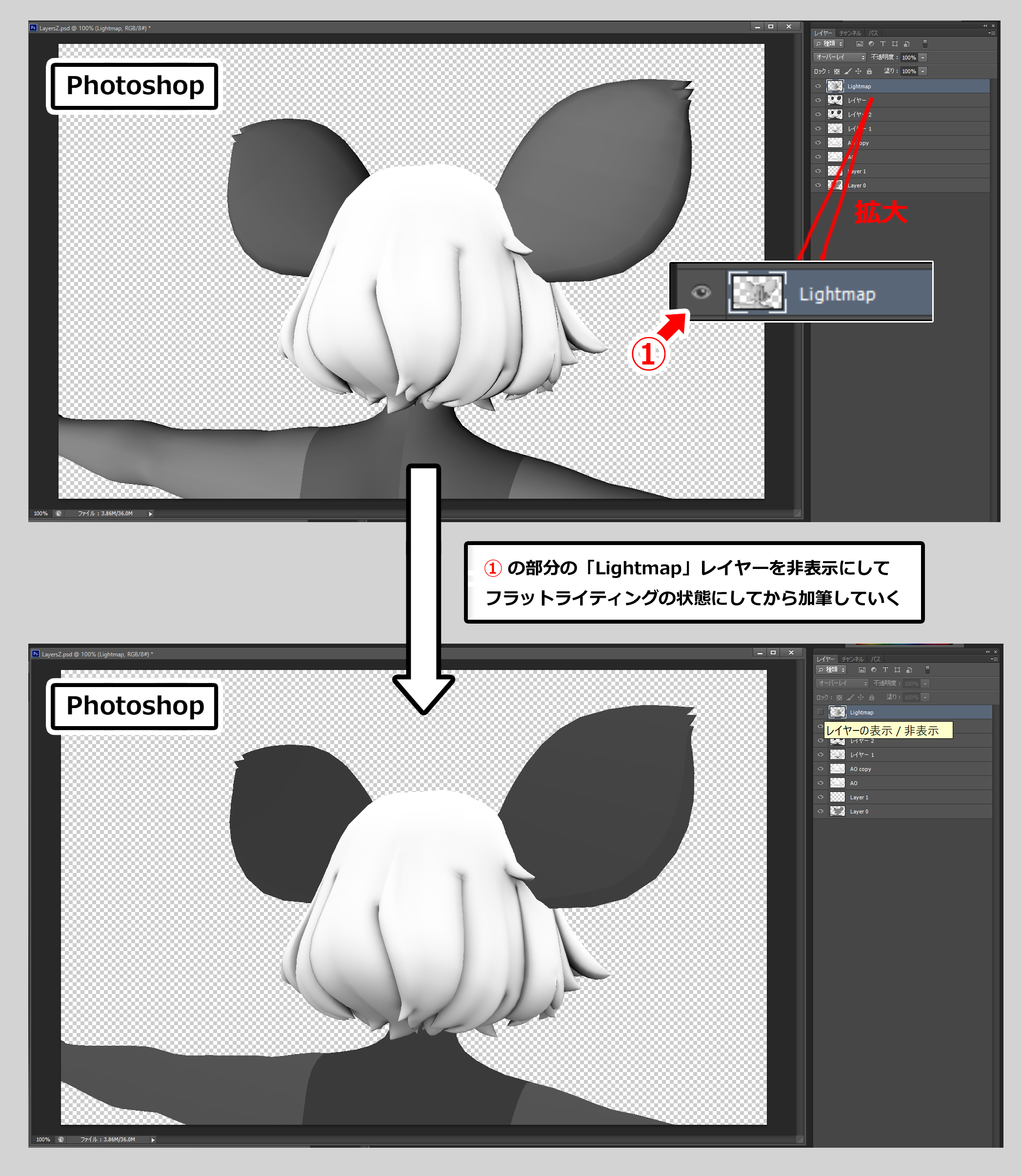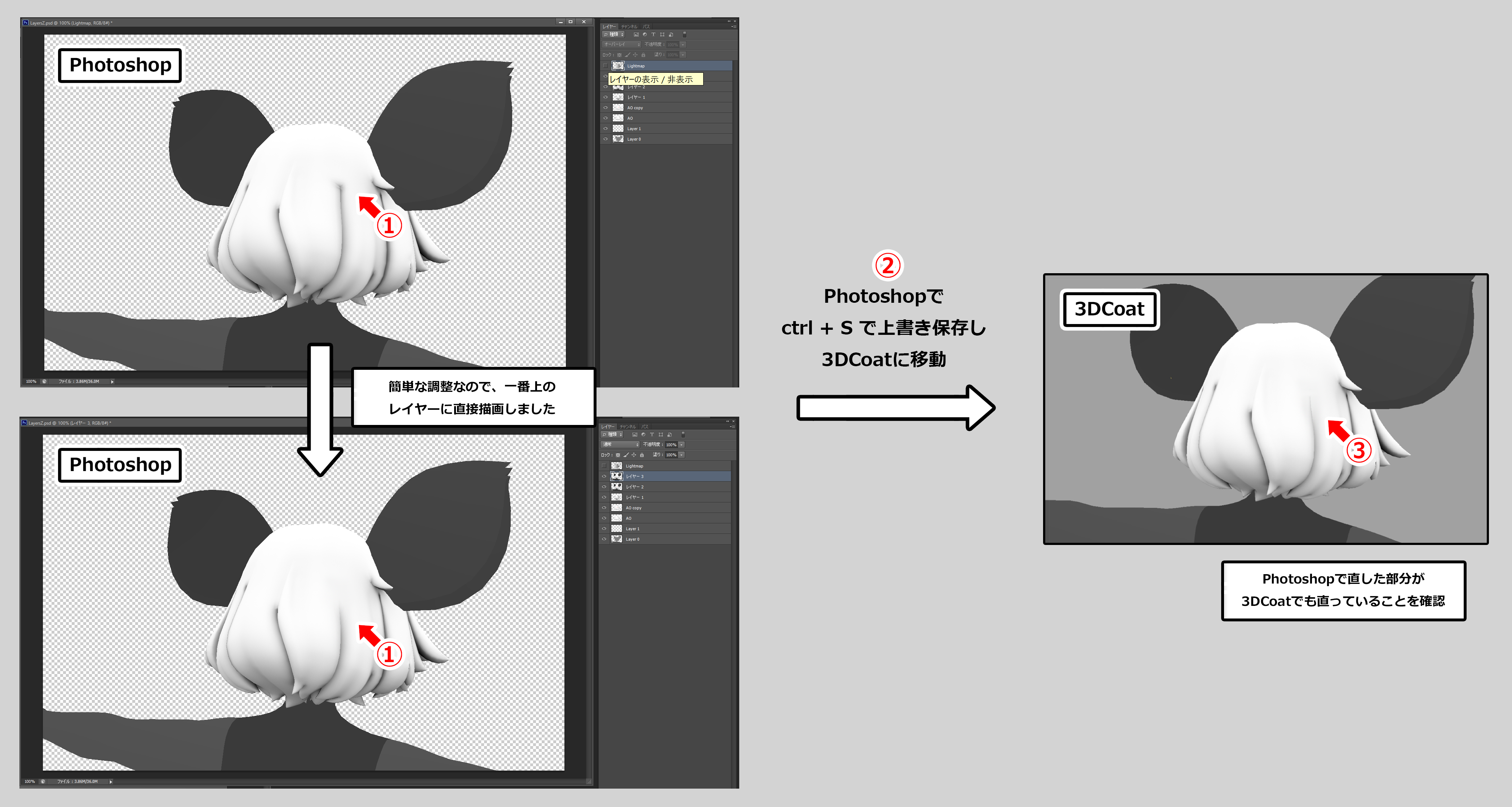 Photoshopで画像を編集する前に、一番上に配置されているレイヤー「Lightmap」を非表示にしておきます【下図①↓】(「Lightmap」レイヤーは加筆を行わない状態を保ってください)。これで3DCoatの画面と同じになります。