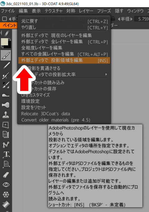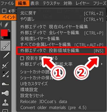 「外部エディタで投影領域を編集」【下図①↓】を選択すると、外部エディタが開きます。「外部エディタで投影領域を編集」はよく使うので、私はInsertにショートカットキーを割り当てています【下図②↓】。今回は外部エディタをPhotoshopにしているので、Photoshopのウィンドウが開きます。