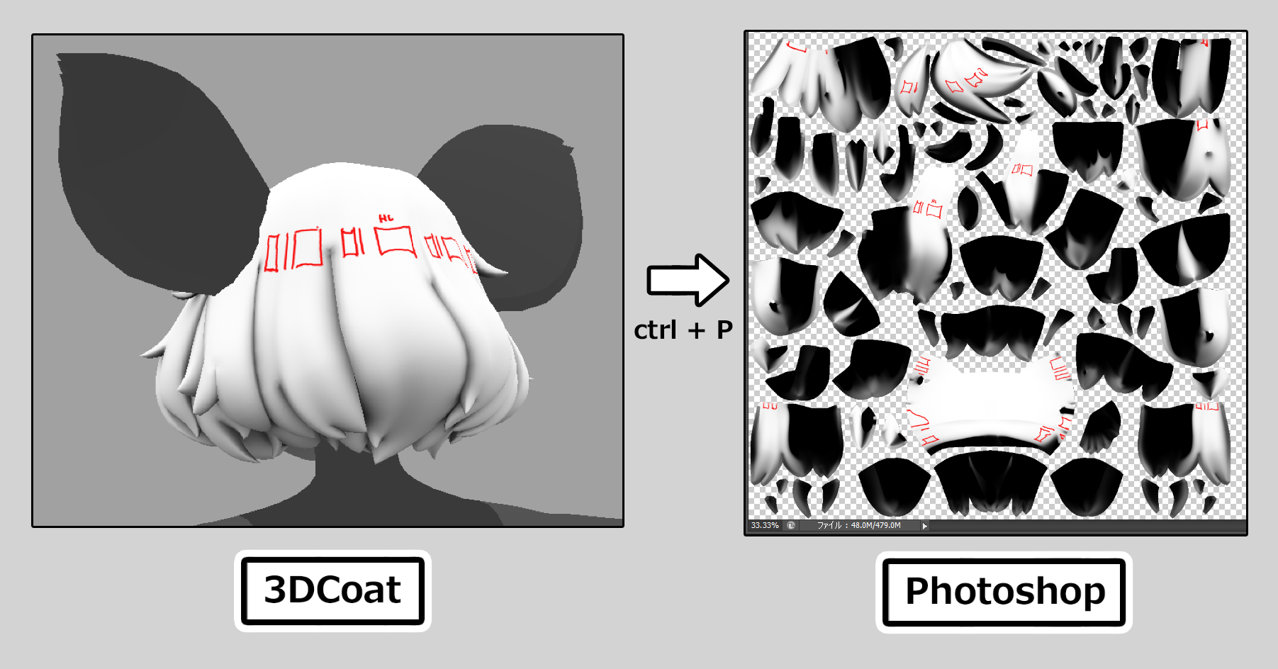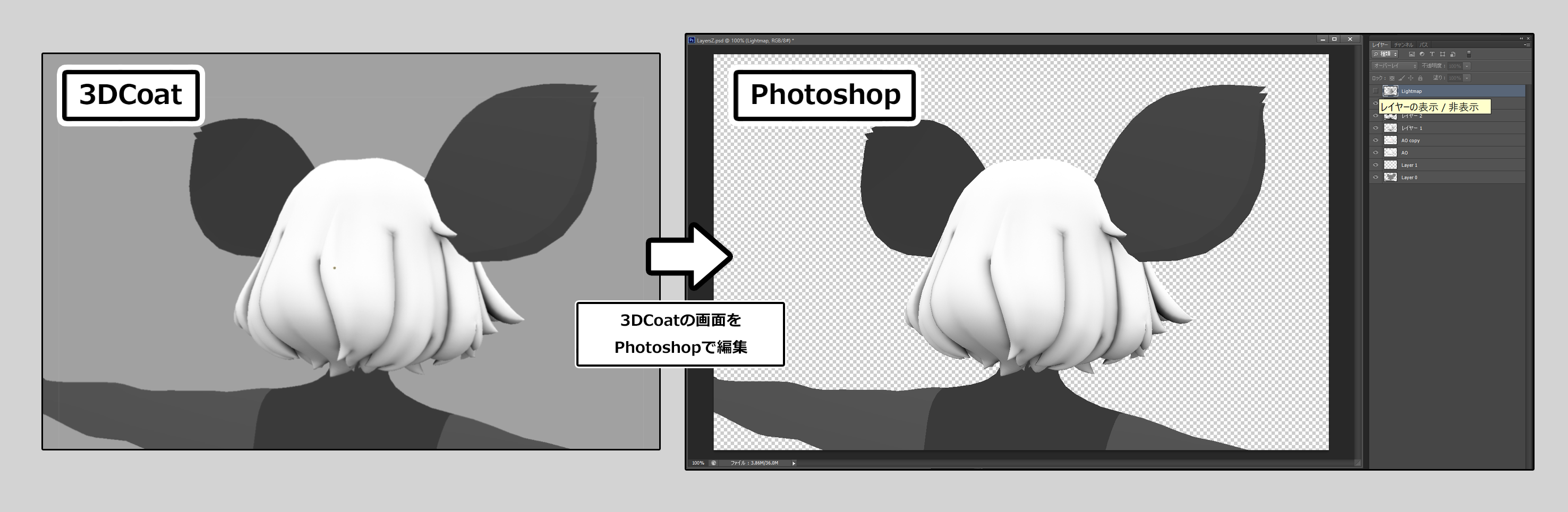【Photoshopだけでは難しい作業を3DCoatを用いて行い、クオリティアップと時間短縮を図る】ことが、今回のコラムの内容です。