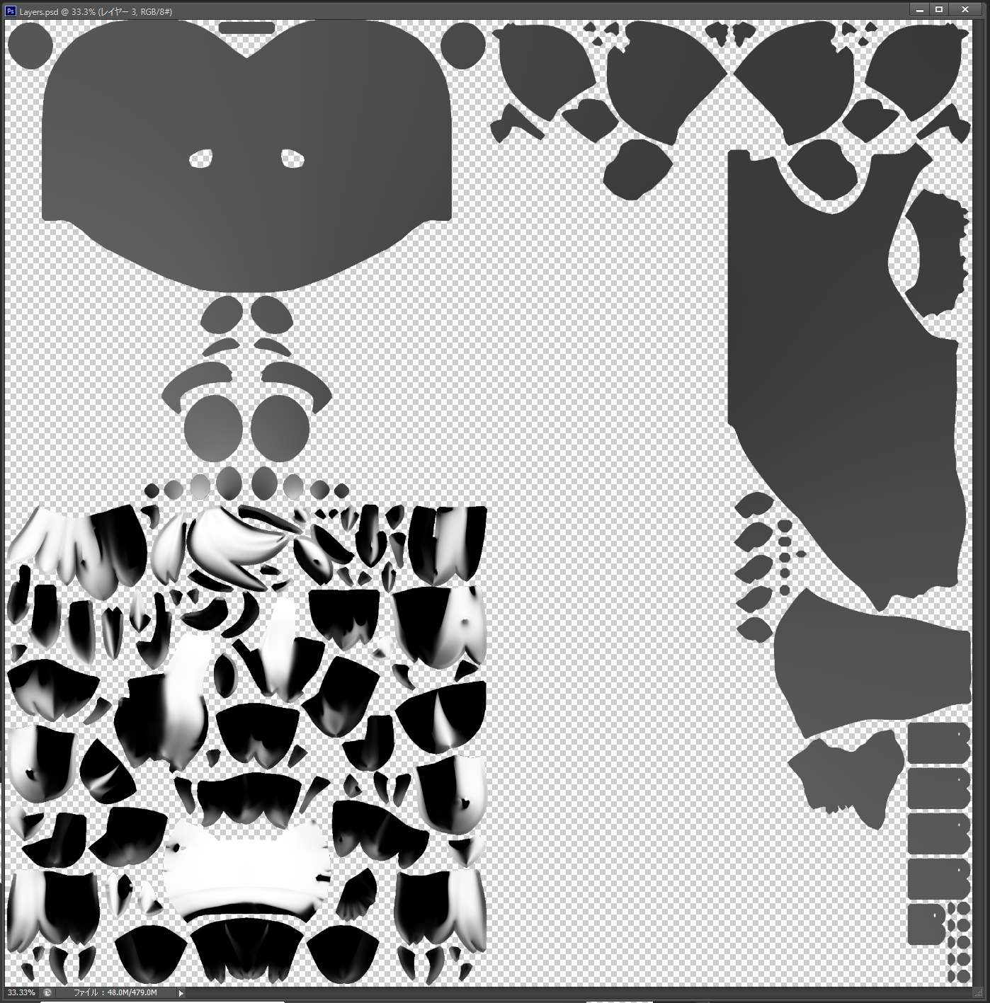 「外部エディタで投影領域を編集」を実行すると、Photoshopが開きます。Photoshopで開かれるウィンドウは、「外部エディタで投影領域を編集」を押したときの3DCoatの画面と同じものになります【下図↓】。Photoshopの画面で調整したものが、3DCoatに反映されるという機能となります!Photoshopのほうが使いやすいという方にはとても便利な機能です。