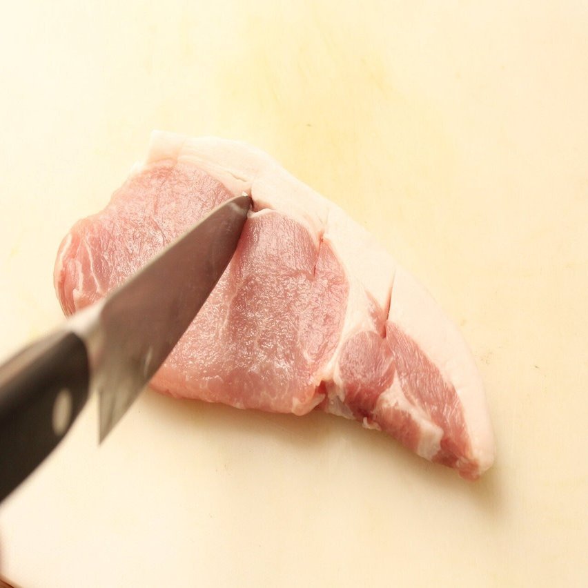 1.肉は脂身と肉の部分の境目に三カ所程度、包丁を入れる。
