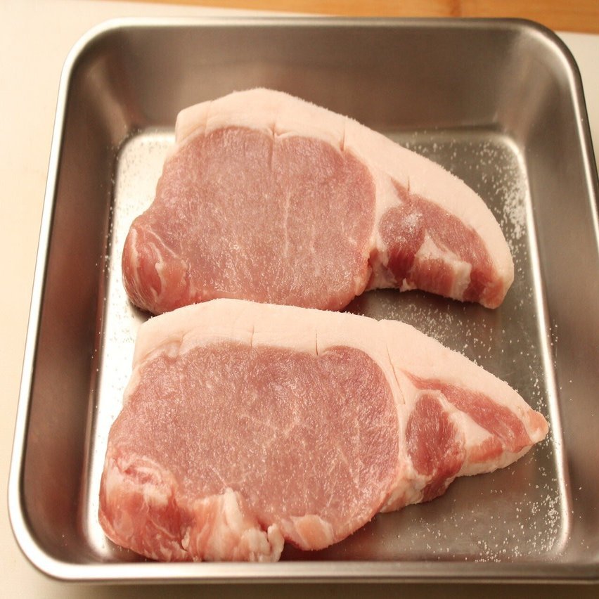 ヒレ肉はやわらかいですが内臓に近いので特有の匂いがあり、味も淡泊なので今回は除外。豚肩ロースは安価で味も濃く、好きな部位なのですが、やや脂が多いので、今回は豚ロース肉を選びました。スーパーでトンカツ用として販売されているやわらかさと味のバランスがいい部位です。豚には国産と輸入がありますが、おすすめは国産。赤い肉のあいだに細かく白い脂肪が入っているのがおいしい豚肉です。