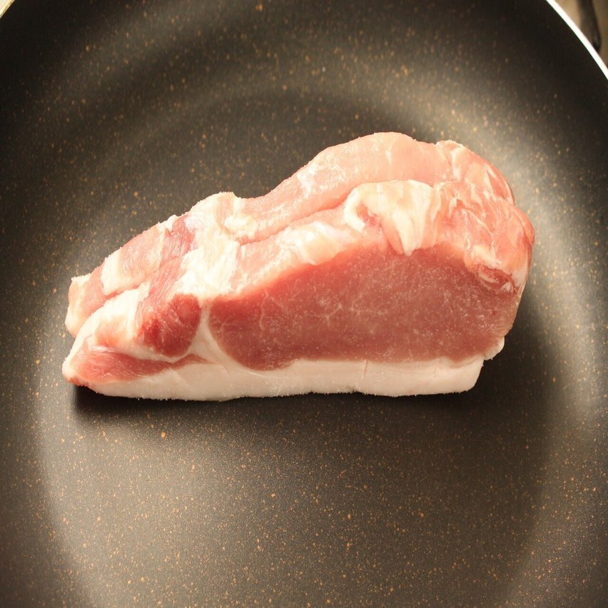 3.植物油小さじ1を敷いた冷たいフライパンに脂身を下にした豚肉を置き、弱火にかける。脂身を焼く目安は5分。