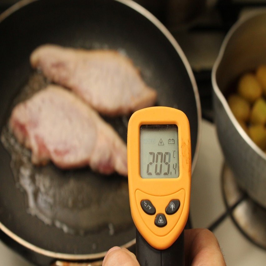 きれいな焼き色がつく表面温度の目安は180℃から200℃。温度計がなくてもジュージューと美味しそうな音が出て、きれいな焼き色がつけば適温とわかります。時間の目安は2〜3分程度。煙が上がるようであれば温度が上がりすぎなので、火を弱めましょう。