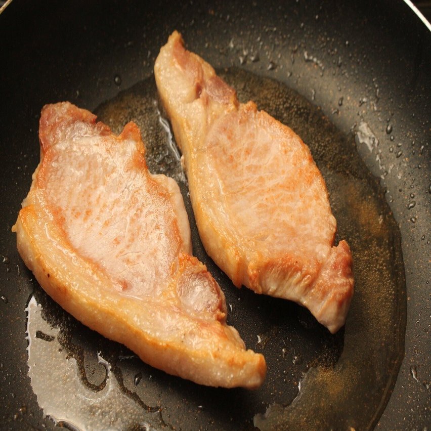 弱火のままだと表面の水分が蒸発されずに煮た状態になってしまい、その水分が飛んで焼き色がつく頃には豚肉に火が入りすぎてしまいます。ソテーした豚肉のおいしさはカリッと焼けた部分のメイラード反応。そこで、フライパンの表面温度をメイラード反応が進む177℃前後以上まで上げるために、火を中火にします。