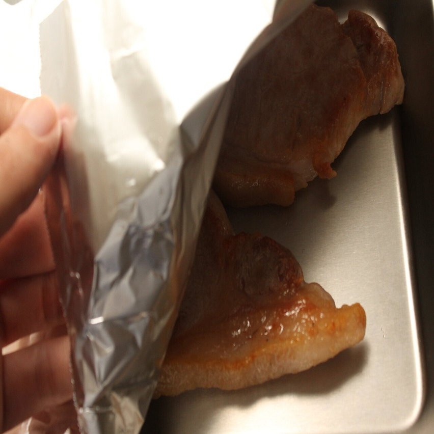 ただ、アルミホイルで完全に包んでしまうと蒸らされた状態になってしまい、表面のカリッとした感じがなくなるので注意。あくまでふんわりとかけて、蒸気は逃がすようにしましょう。