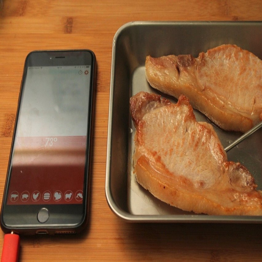 肉を室温に出しておく目的は『生焼けを防ぎ』『加熱ムラをなくす』の二つ。今回、冷蔵庫から出したての豚肉の中心温度を計ってみると6℃。多くの料理本が「20分前に肉を出しておく」ことを推奨しているので、10分間隔で肉の中心温度を確認しました。
