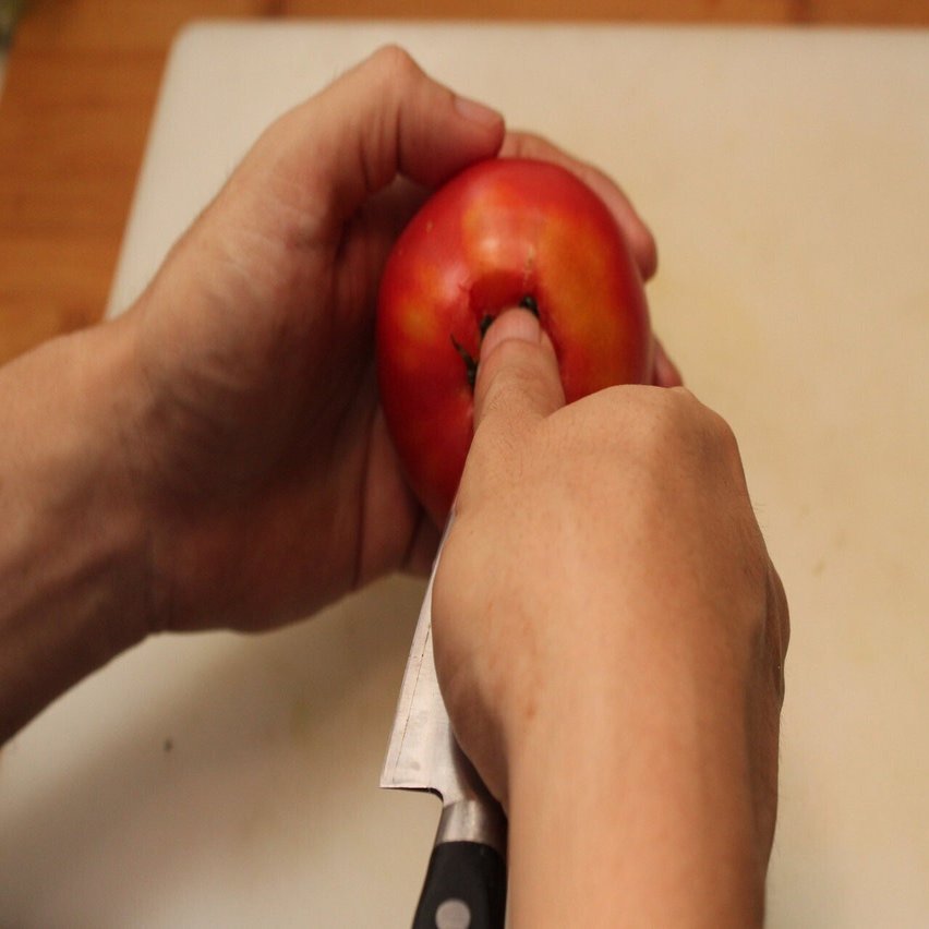 作り方は簡単。まずはトマトのへたをとります。トマトのへたを取るときは、包丁の先を差し込み、トマトを回すようにします。