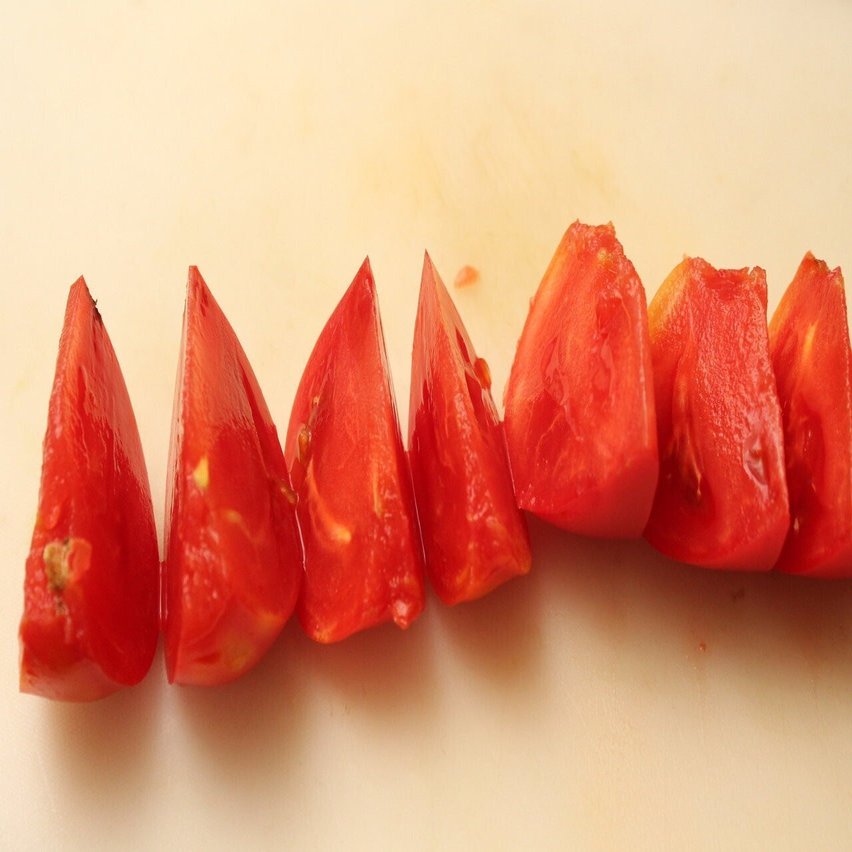 へたをとったトマトを8等分の櫛形に切ります。