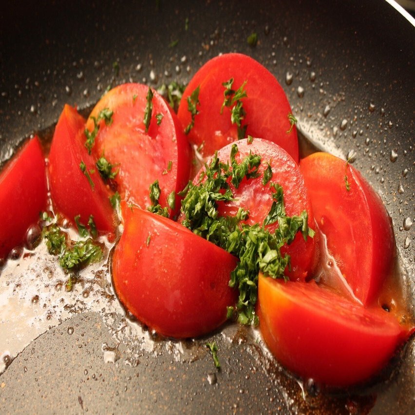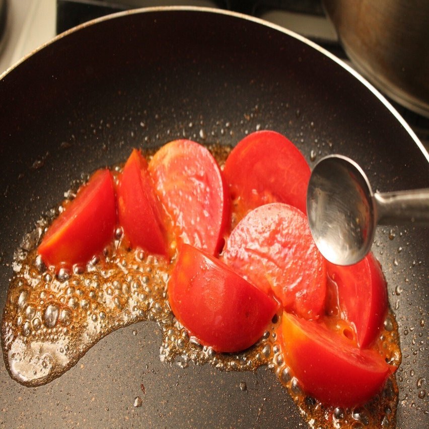 さきほどの肉を焼いたフライパンの脂を捨ててから、トマトを加え、中火で加熱していきます。あまり長く火にかけると崩れるので注意。トマトが温まり、表面が少し溶けるくらいが目安です。トマトが甘いので酢の酸味を少し加えてバランスをとります。肉に塩気があるので、塩は不要。