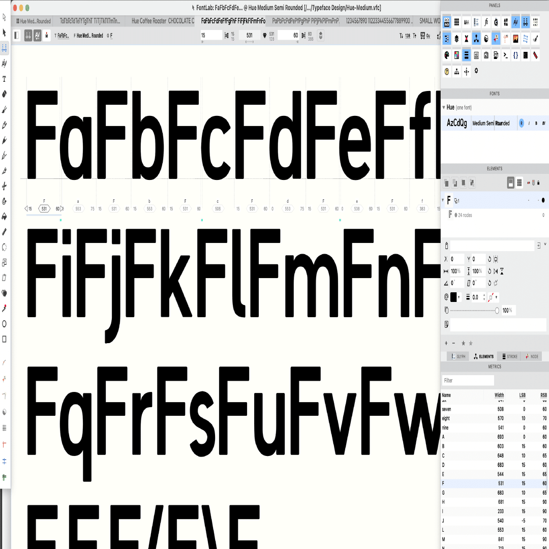 最後にFontLabというソフトでメトリクス(文字ごとの前後のアキ)の調整や、ペアカーニング(文字の組み合わせごとのツメ)の設定をしています。