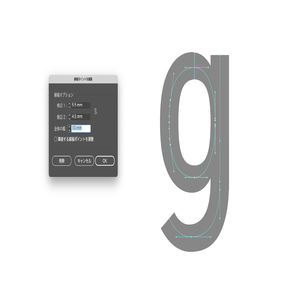 今回はじめてやってみたのですが、Illustratorの線幅ツールを使って作ってみました。後からウェイトのバリエーション作りやすいように、まずは骨格を作って、それに線幅ツールで肉付けしています。そのままだときれいな線にならないので、パスのアウトラインを取ってから、形を整えたり視覚調整をしています。