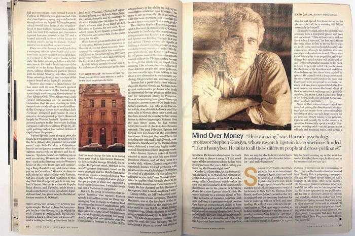 Then there is Stephen Kosslyn, a psychologist at Harvard. Epstein flew up to Kosslyn’s laboratory in Cambridge this year to witness an experiment that Kosslyn was conducting and Epstein was funding. Namely: Is it true that certain Tibetan monks are capable of holding a distinct mental image in their minds for twenty minutes straight? “We disproved the thesis,” says Kosslyn. “Jeff was on his cell phone most of the time — he actually wanted to short the Tibetan market, because he thought the monk was so stupid. He is amazing. Like a honeybee — he talks to all these different people and cross-pollinates. Just two months ago, I was talking to him about a new alternative to evolutionary psychology. He got excited and sent me a check.”