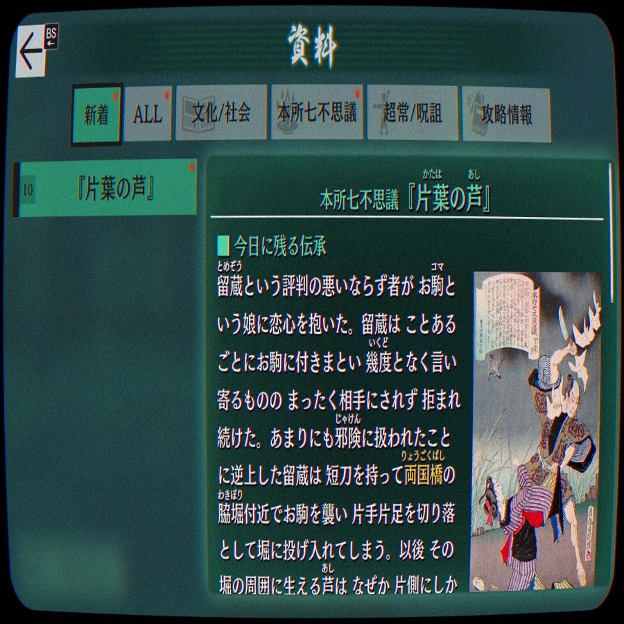 先日、ずっと前からタイトルを聞いたことがあって気になっていた「パラノマサイト FILE23本所七不思議」を遊び、クリアしました。結論から先に言うととんでもなく面白かった……!!!!!!