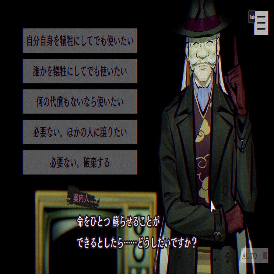 本作では案内人から「命をひとつ蘇らせる力があったらどうするか」と、初めと終わりに二度問われます。この質問に対して、二度目の時は死者の蘇生を完全に否定する選択肢が増える演出も大好きです。