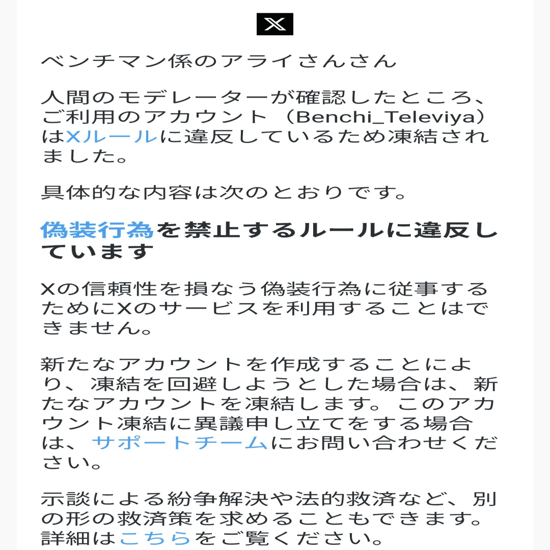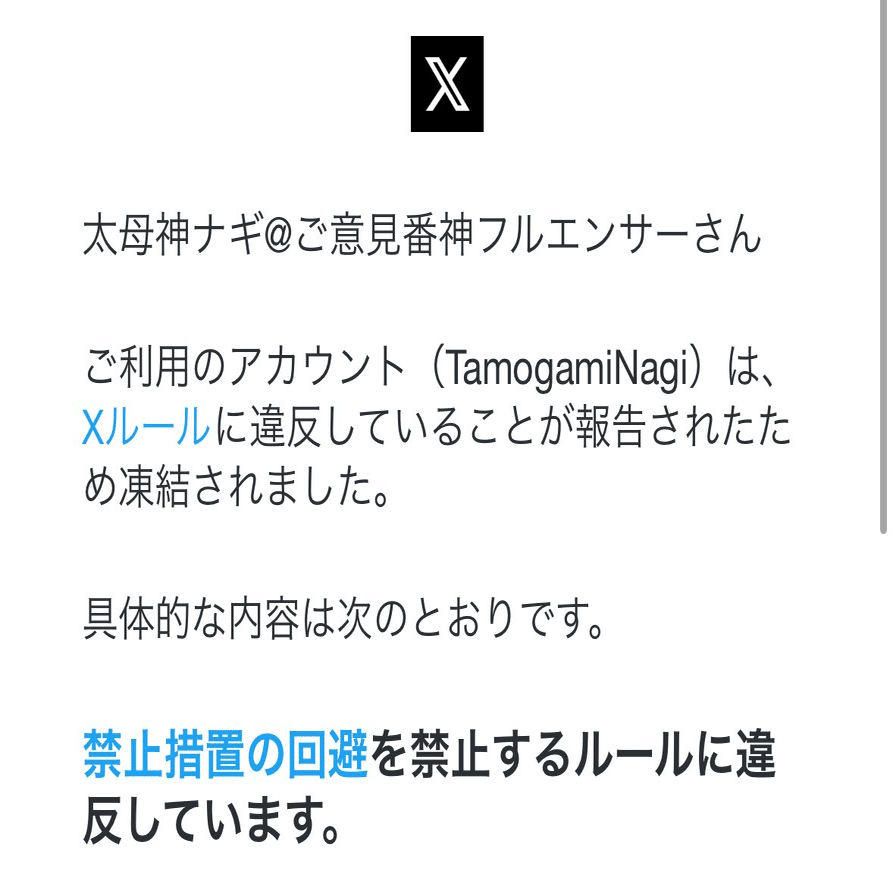 そもそも私も受けた凍結内容の偽装アカウントでのBANは比較的多く、note上でも同様の理由でXのアカウント凍結されている被害者の記事が散見される。引用すると通知が行くのでここでは載せませんが。