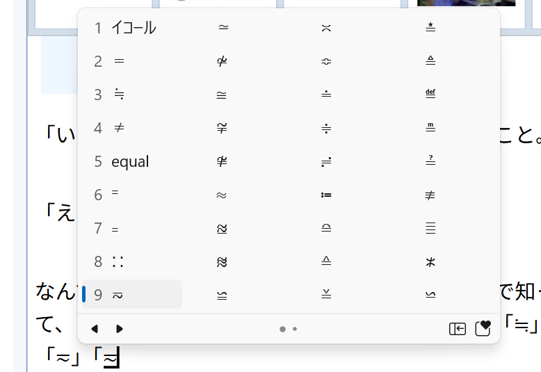 私は「≒」が「ニアリーイコール」って呼ぶことを知ってたのに・・・!なのに、一発変換もできず、さらにいっぱい変なイコールを見る機会も失われていて・・・!