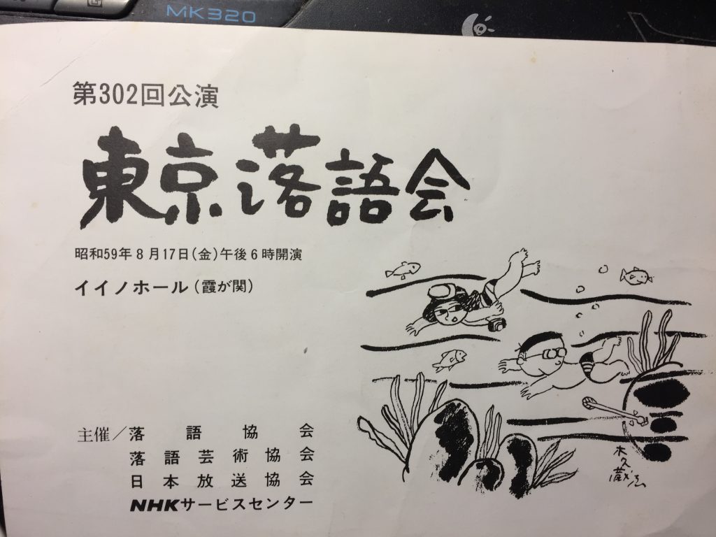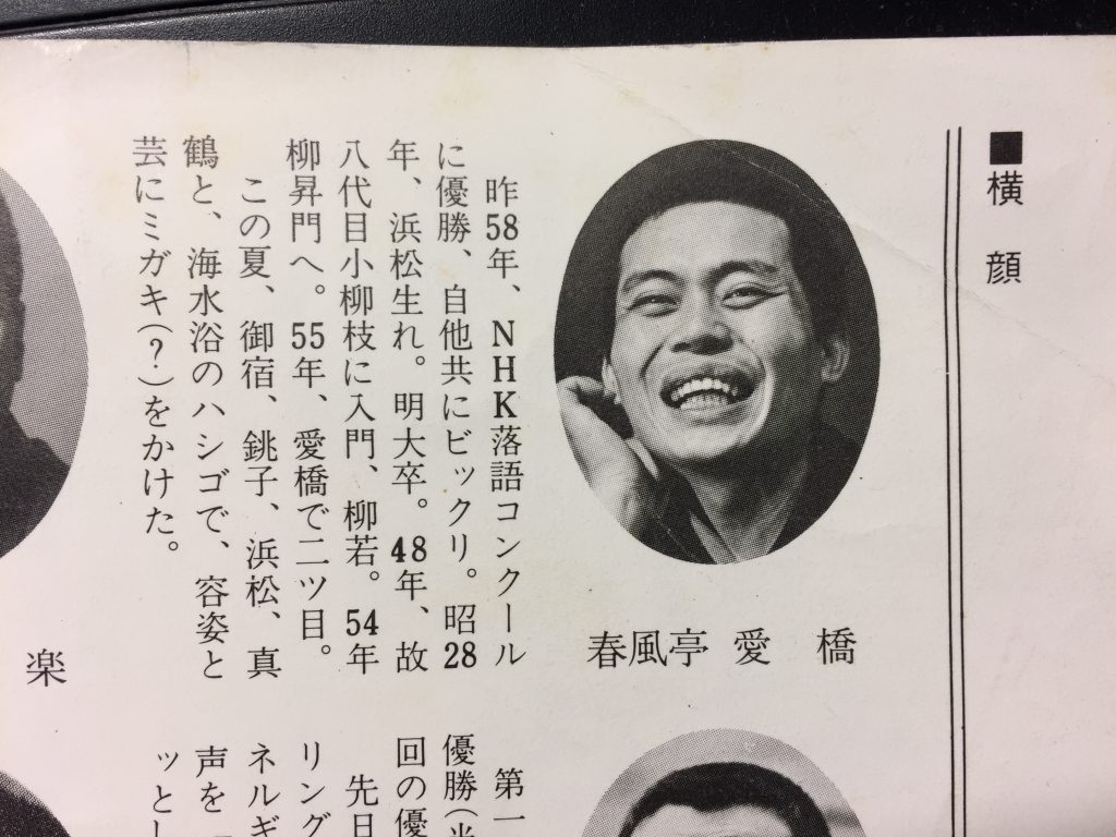 下の写真は、私が高校生のときに初めてイイノホールで開かれていた東京落語会に行ったときにもらったパンフレットである。偶然ではあるが、このときに二ツ目として出演していたのが、前年にNHK落語コンクールで優勝を果たした注目株の春風亭愛橋こと、後の瀧川鯉昇さんであった。正月に実家に帰った際にこれを拝見して、ぜひご本人にもお店しなければと持参した次第である。
