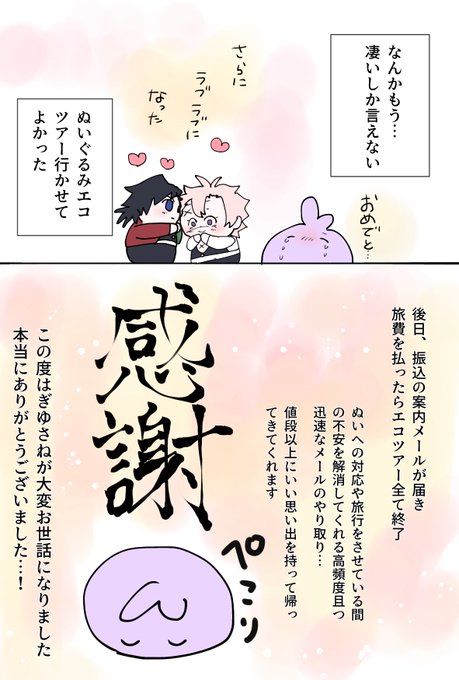ぎゆさね新婚旅行レポート(5/5) 帰宅した子達の土産話を聞いたり(ブックレットやUSBデータ)お土産を食べたり(同梱されてくるお菓子)至れり尽くせりなぬいぐるみエコツアー ただただ感謝しかありません ぎゆさね結婚おめでとう🎊 ありがとうございました!!