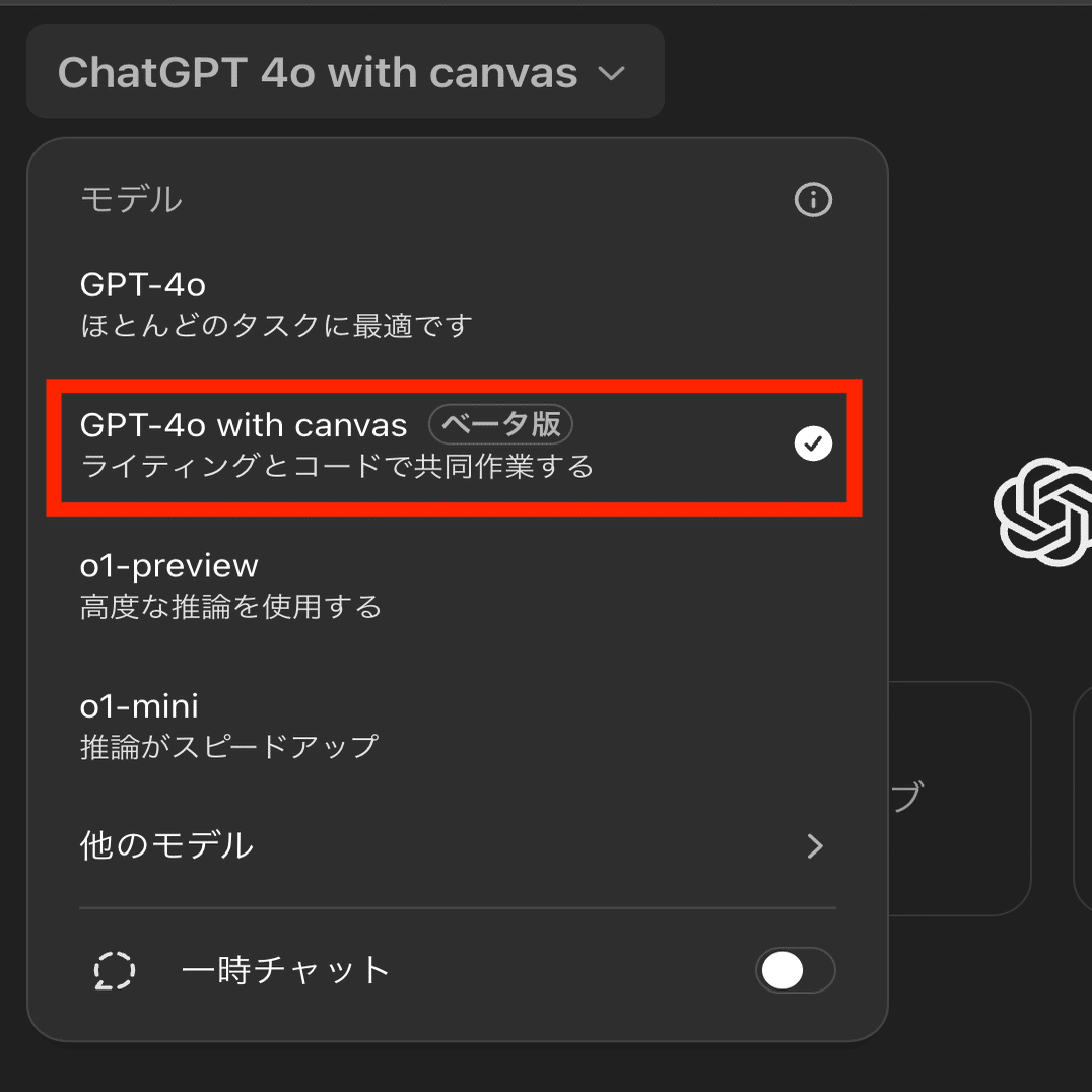 まずは、左上のモデル選択リストから、「GPT 4o with canvas」を選択します。