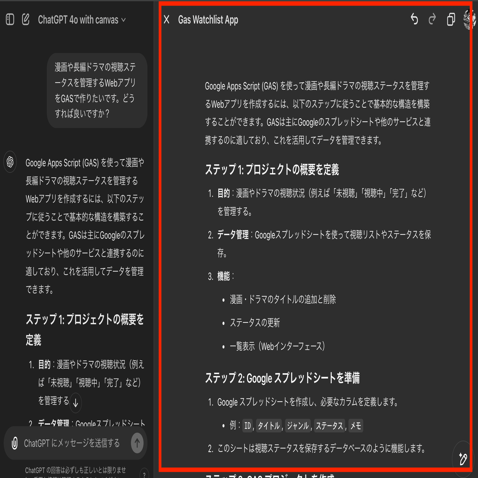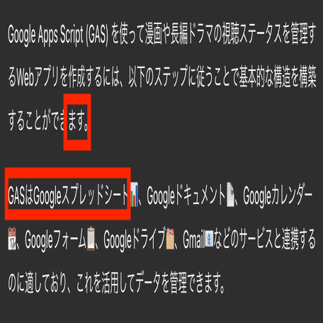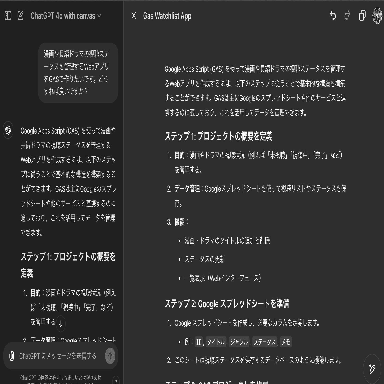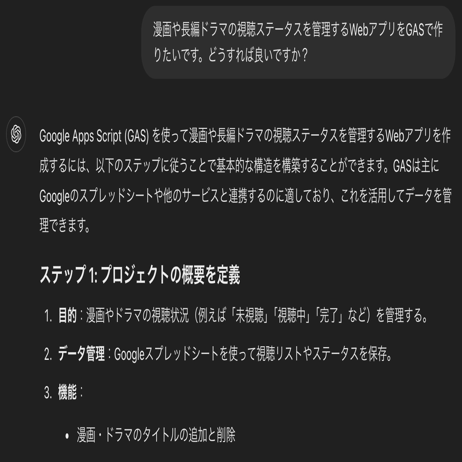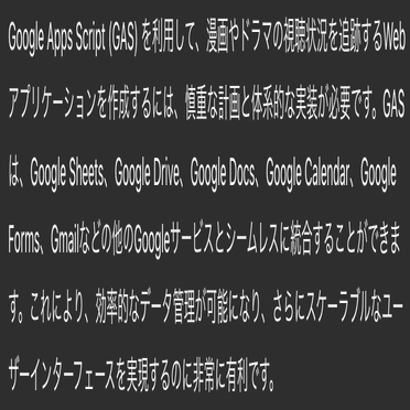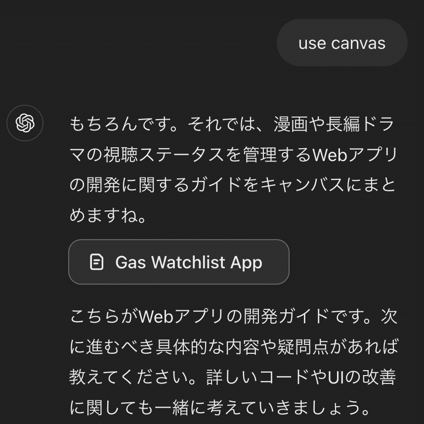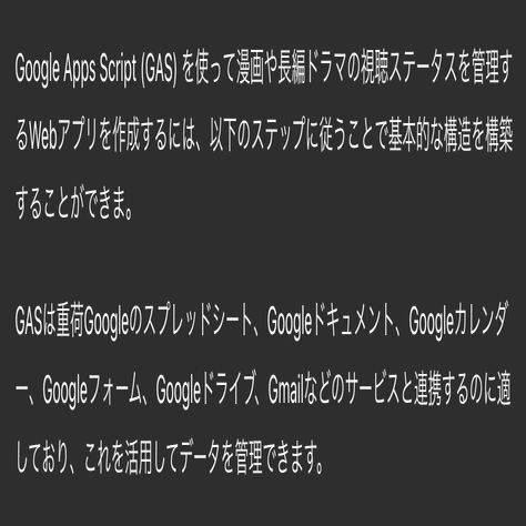 漫画や長編ドラマの視聴ステータスを管理するWebアプリをGASで作りたいです。どうすれば良いですか?すると、自動でcanvasが始まる場合もありますが、自動で始まらない場合もあります。