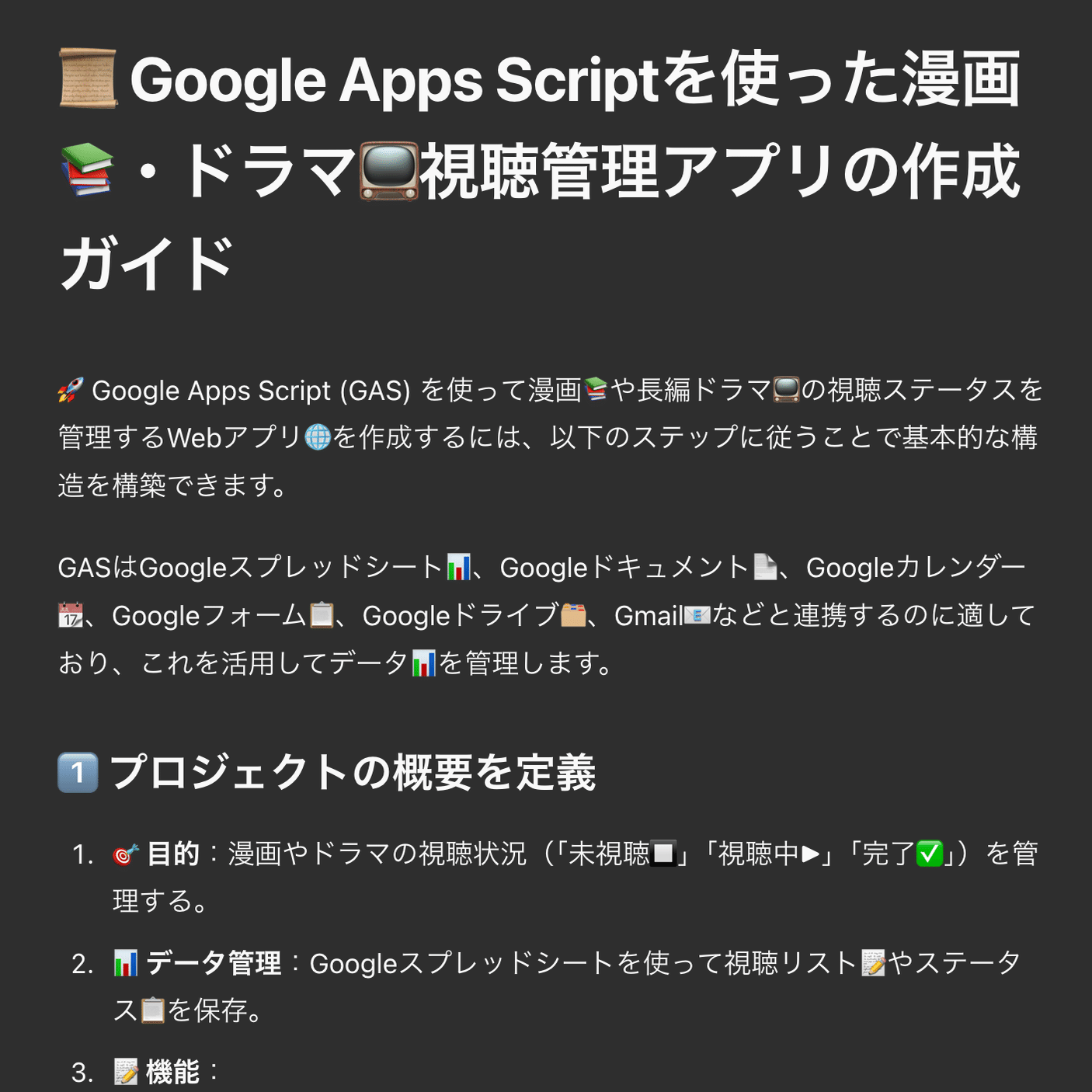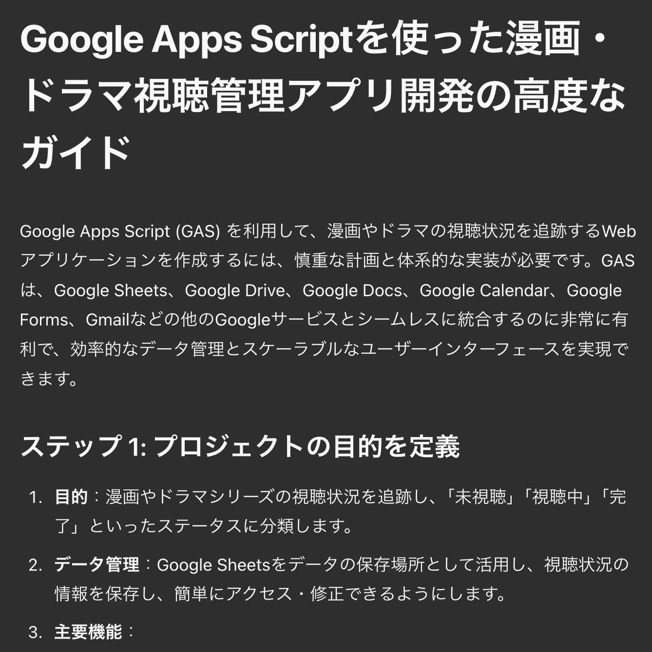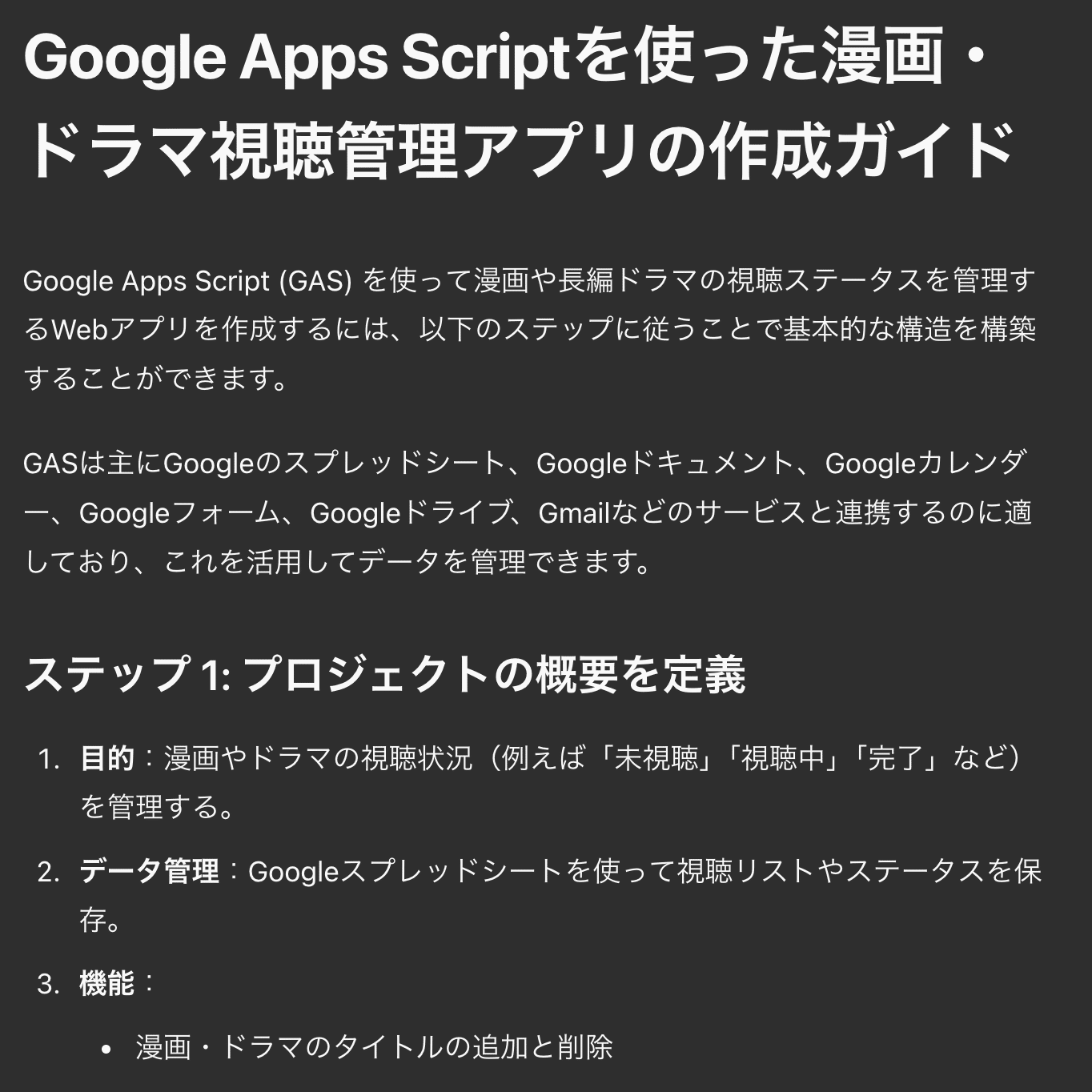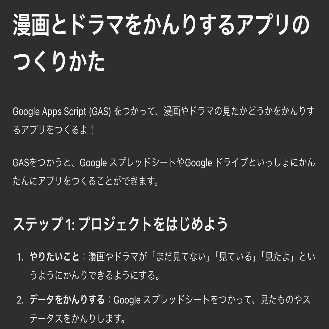 漫画や長編ドラマの視聴ステータスを管理するWebアプリをGASで作りたいです。どうすれば良いですか?すると、自動でcanvasが始まる場合もありますが、自動で始まらない場合もあります。