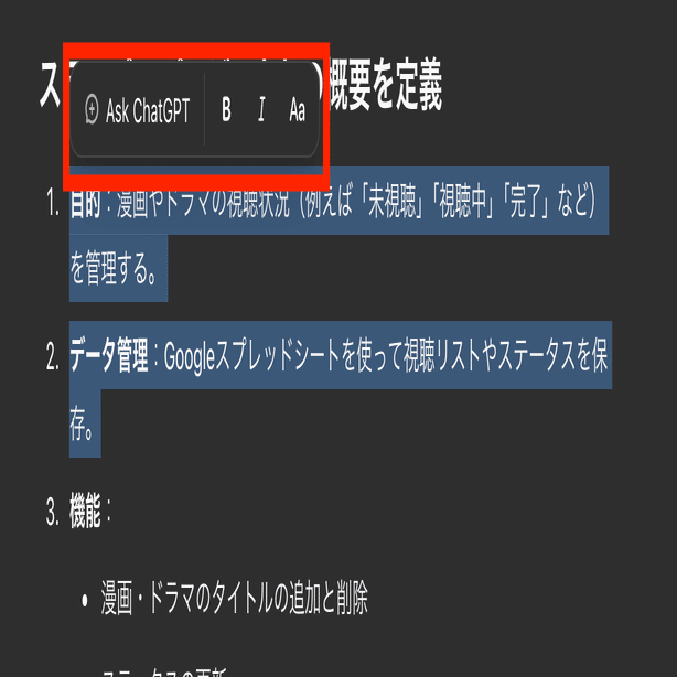 全体編集機能とは、スレッドに出力された結果を、ChatGPTが一括して編集する機能です。