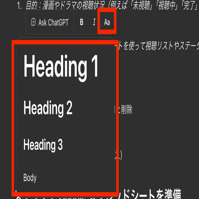 文をドラッグする場合は、「Ask ChatGPT」の右側に、文字編集機能がくっついており、該当箇所の文字フォントを太字(Bold)にしたり、斜体(Italic)にしたり、HTMLにおけるマークアップのレベルの指定を変更(下図参照))することもできます。