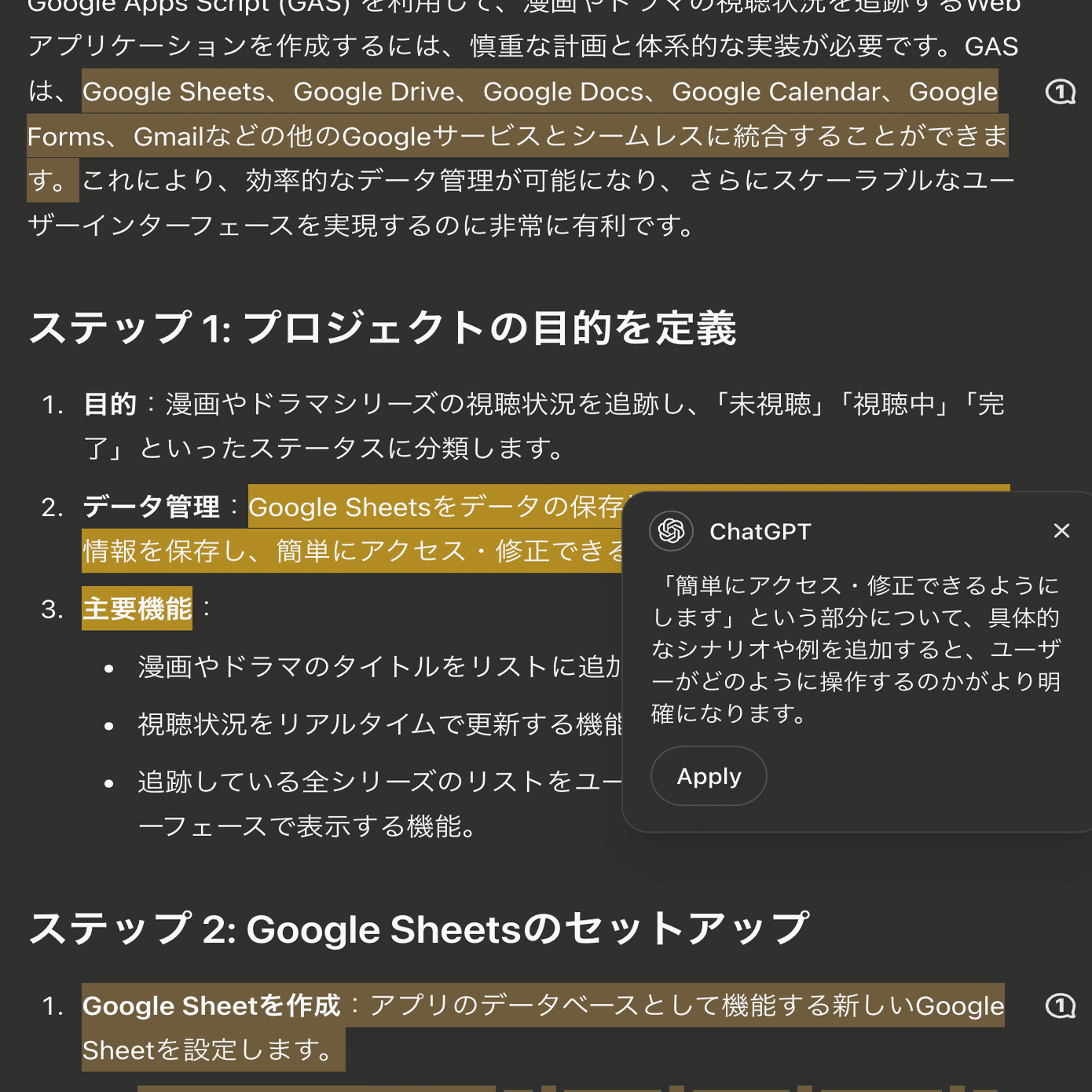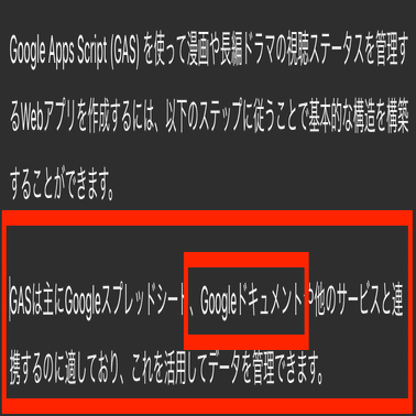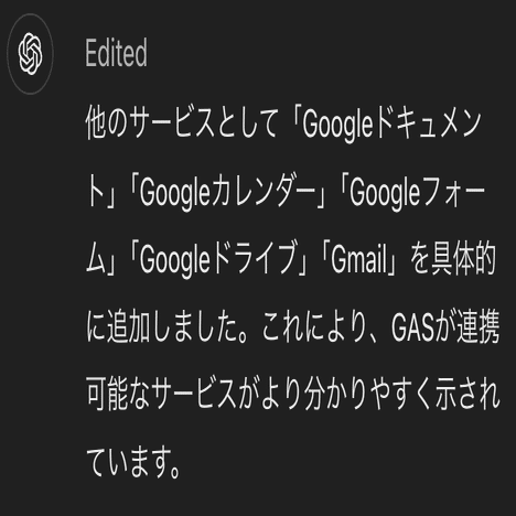 出力された文章全体から、「編集したらいいよ」とChatGPTからおすすめされる箇所が反転して示されます。