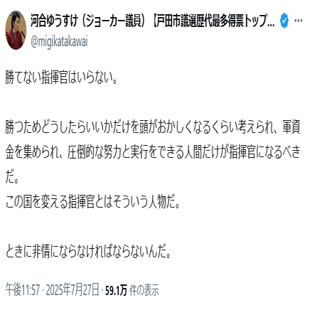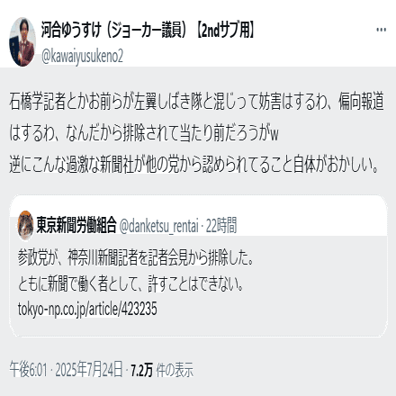 ⓽河合ゆうすけは参政党に宥和的な姿勢をとる人物です(こちら)。