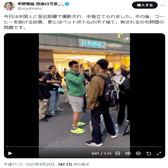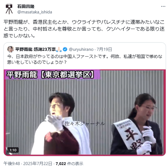 ⑦平野雨龍がヘイトを煽っているんじゃなくて、平野雨龍がヘイトに晒されていたのである。日本人が奮起しないまま国を乗っ取られたら、最終的には日本人全体が中国人によるヘイトのターゲットになるだろう。