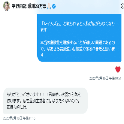 ⑫選挙では平野雨龍を「ヘイター/排外主義者」と捉える反応も多かったと思います(こちら)。