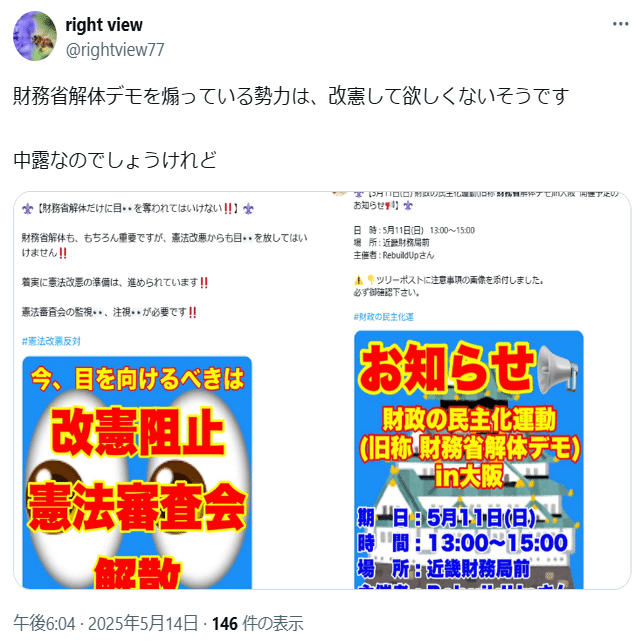 財務省解体デモを煽っていた人たち(中露)は、「改憲」から目を逸らさせたかったようです(こちら)。