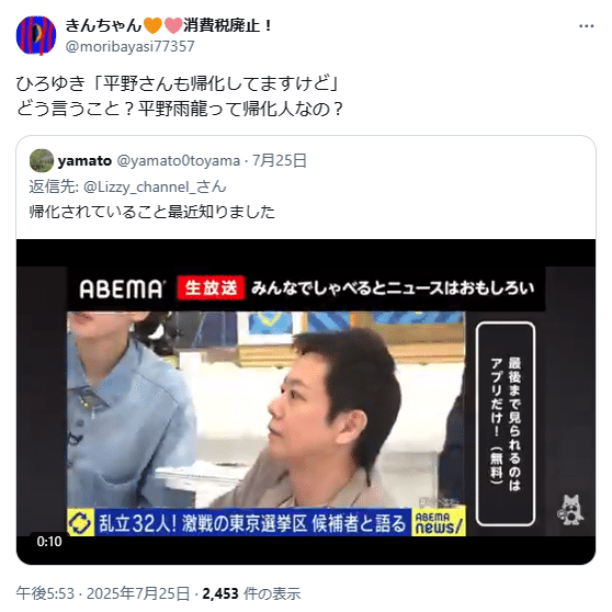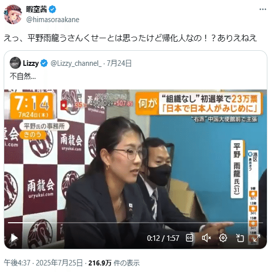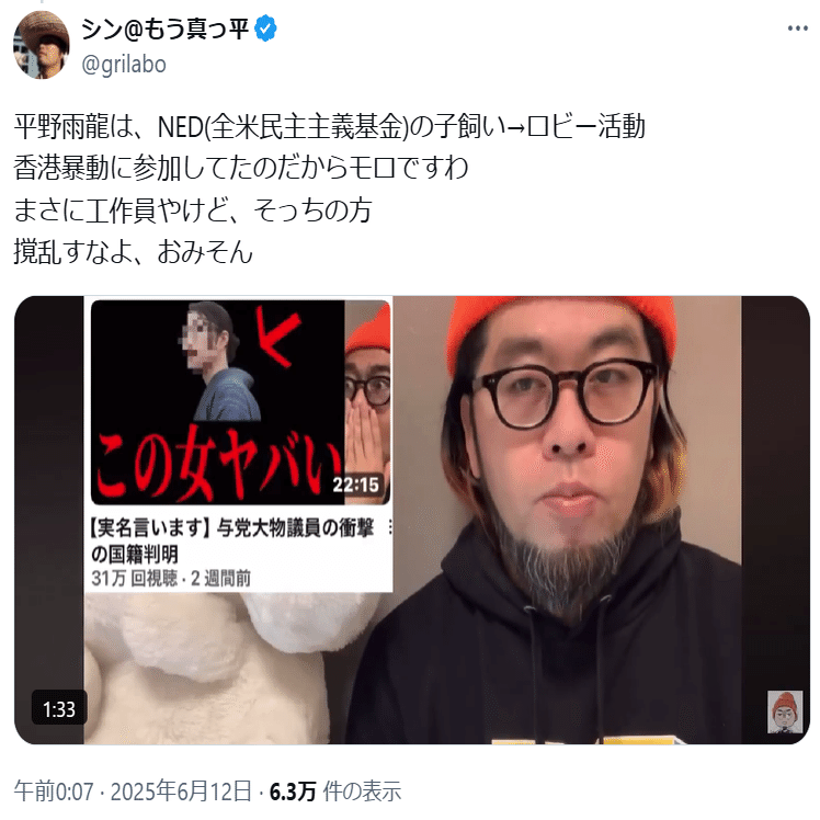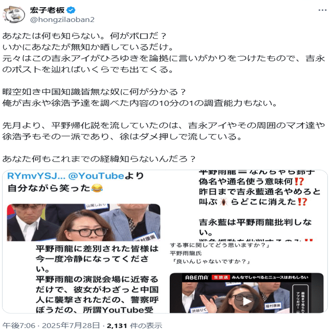 ⑥参政党を支持して陰謀論を煽るアカウントが平野雨龍帰化人疑惑を煽っています(こちら)。