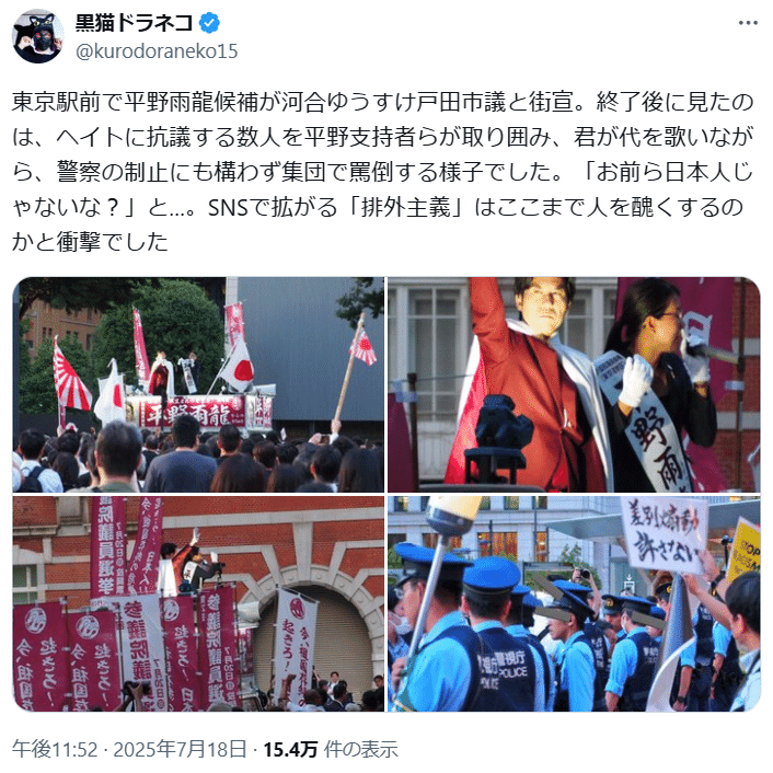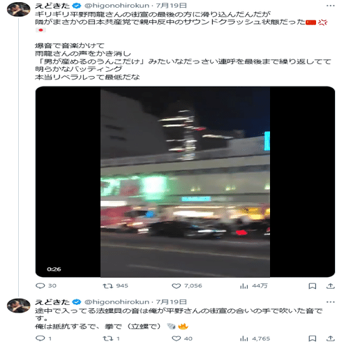 動画を見ると、確かに平野雨龍の演説は排外主義を煽るトーンになってしまっています。。。聴衆の反応を見ながら調整したのでしょうね。