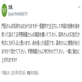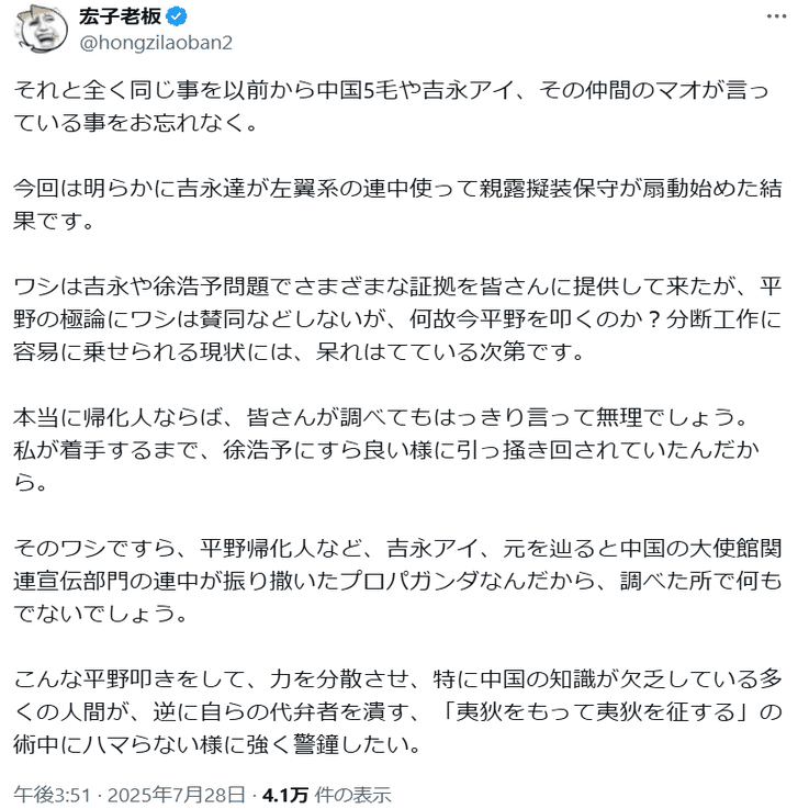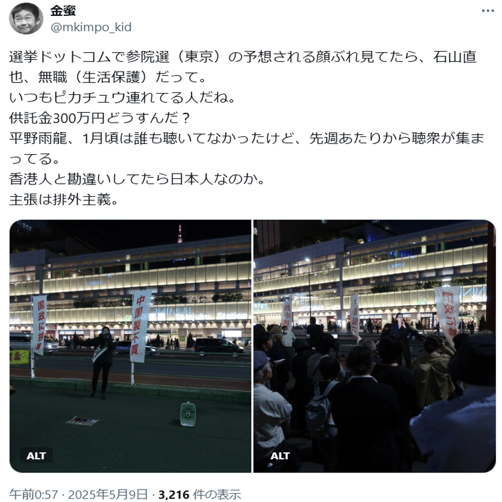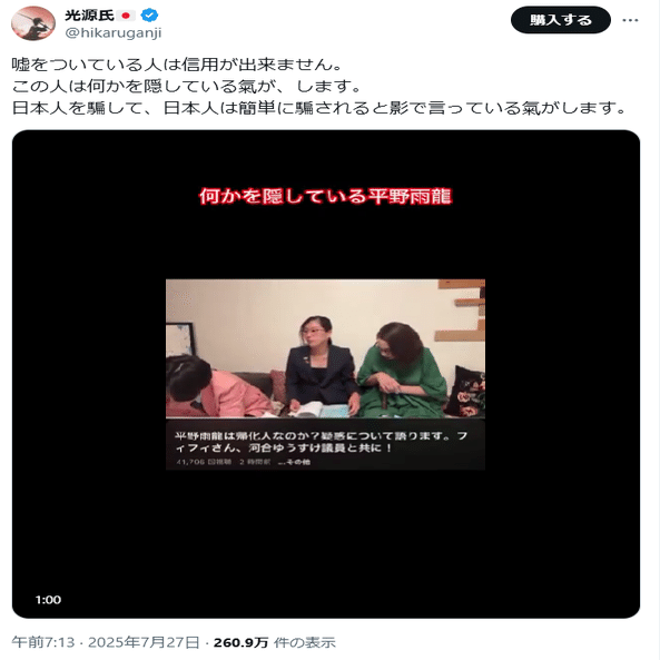 ①平野雨龍に対して「排外主義者」というイメージを持つ人もいるようです(こちら)。