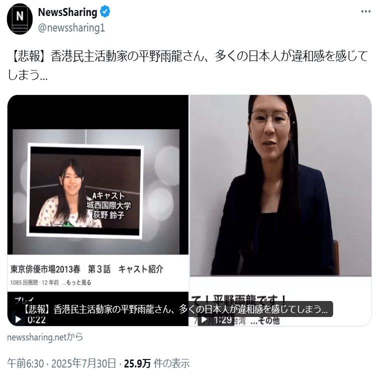 ⑧参政党の宣伝役アカウントであるNewsSharingも平野雨龍帰化人デマを煽っています(こちら)。