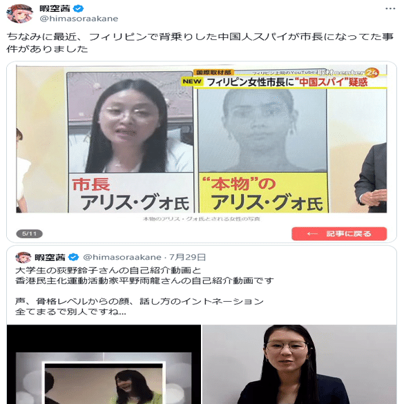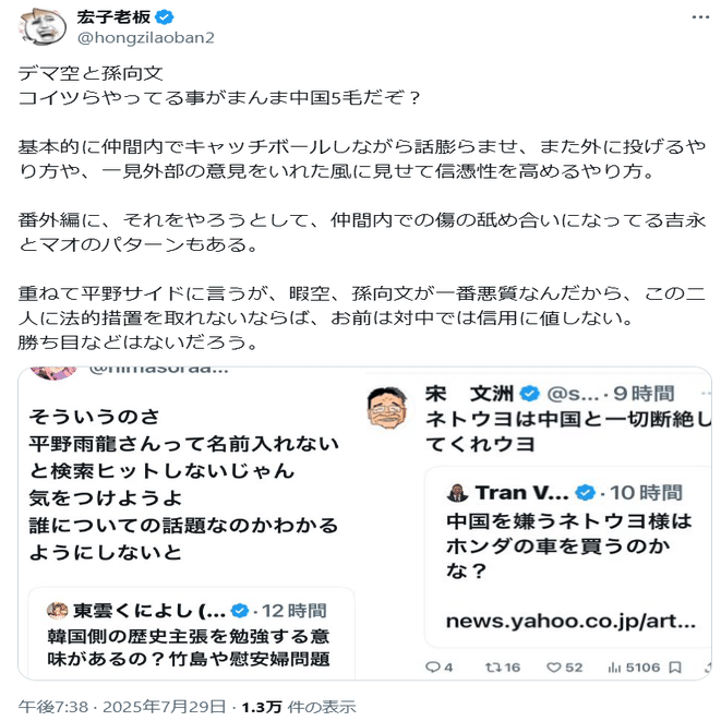 ⑱「暇空茜と東雲くによしがキャッチボールしながらデマを膨らませているのは、中国がデマを撒き散らす際の典型的なやり口だ」という指摘です(こちら)。