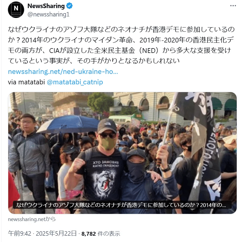 ⑩全米民主基金はロシアが目の敵にしている団体です。こちらは、参政党の宣伝役アカウントがウクライナを貶める目的で全米民主基金黒幕説を撒き散らしている例です。
