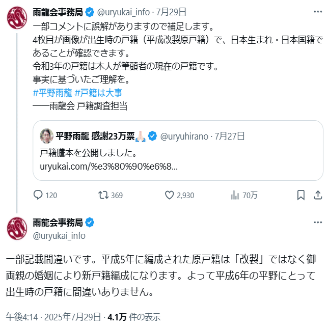 【補足2:平野雨龍帰化人デマ】