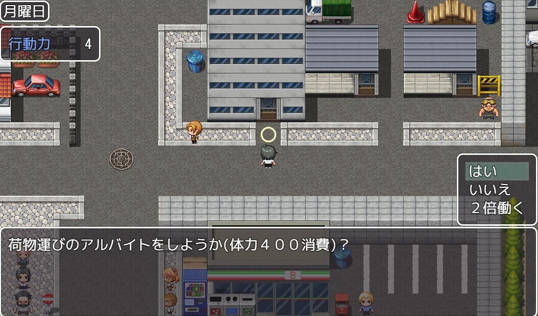 まずは銭湯とコンビニでアルバイトをして、回復力と行動力を上げておく。