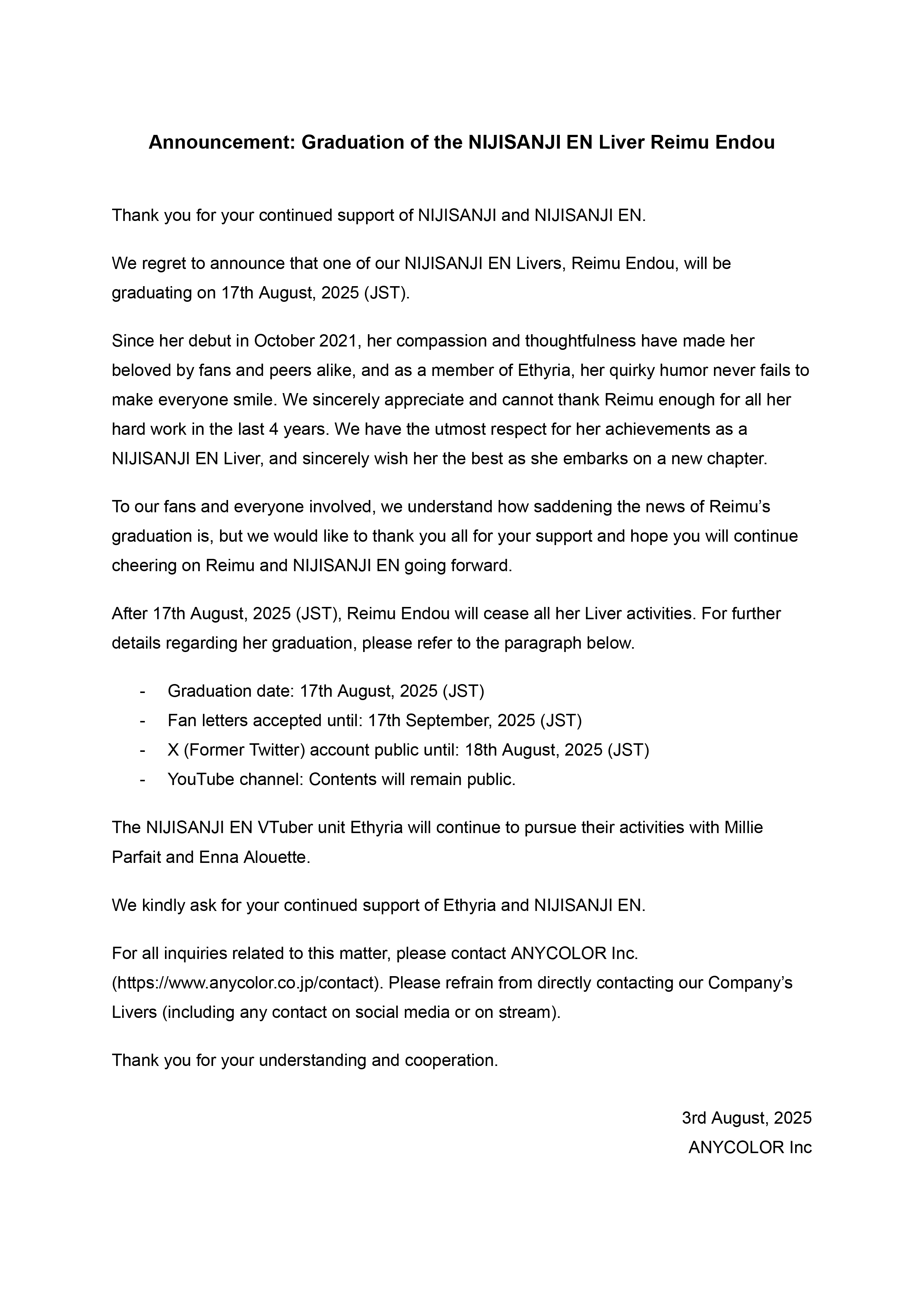 We regret to inform you that the NIJISANJI EN Liver Reimu Endou will be graduating on 17th August, 2025 (JST).