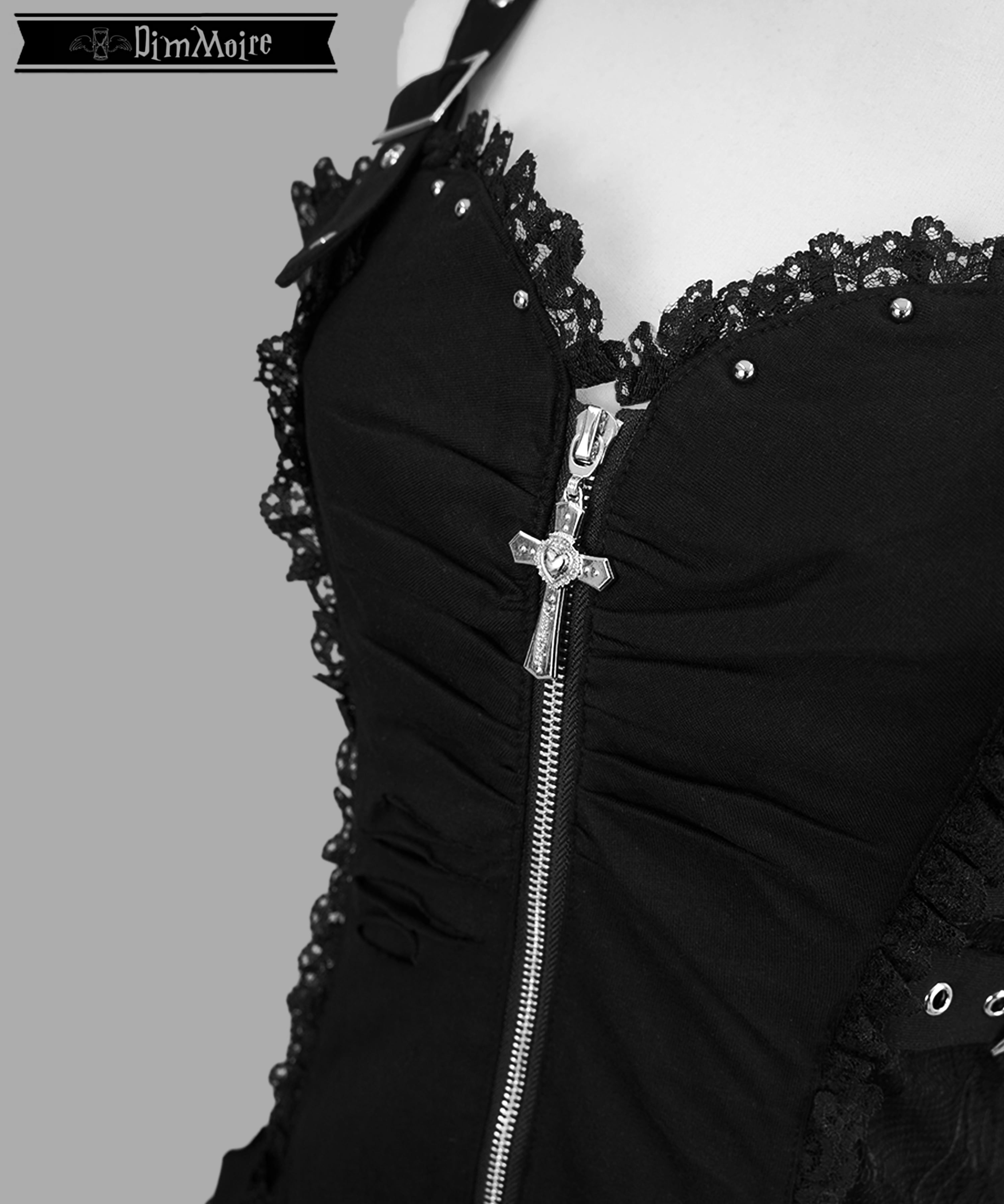 胸元に輝くDimMoireオリジナル十字架ジップチャームと、ジップアップのセンターラインが放つ“強さ”.
