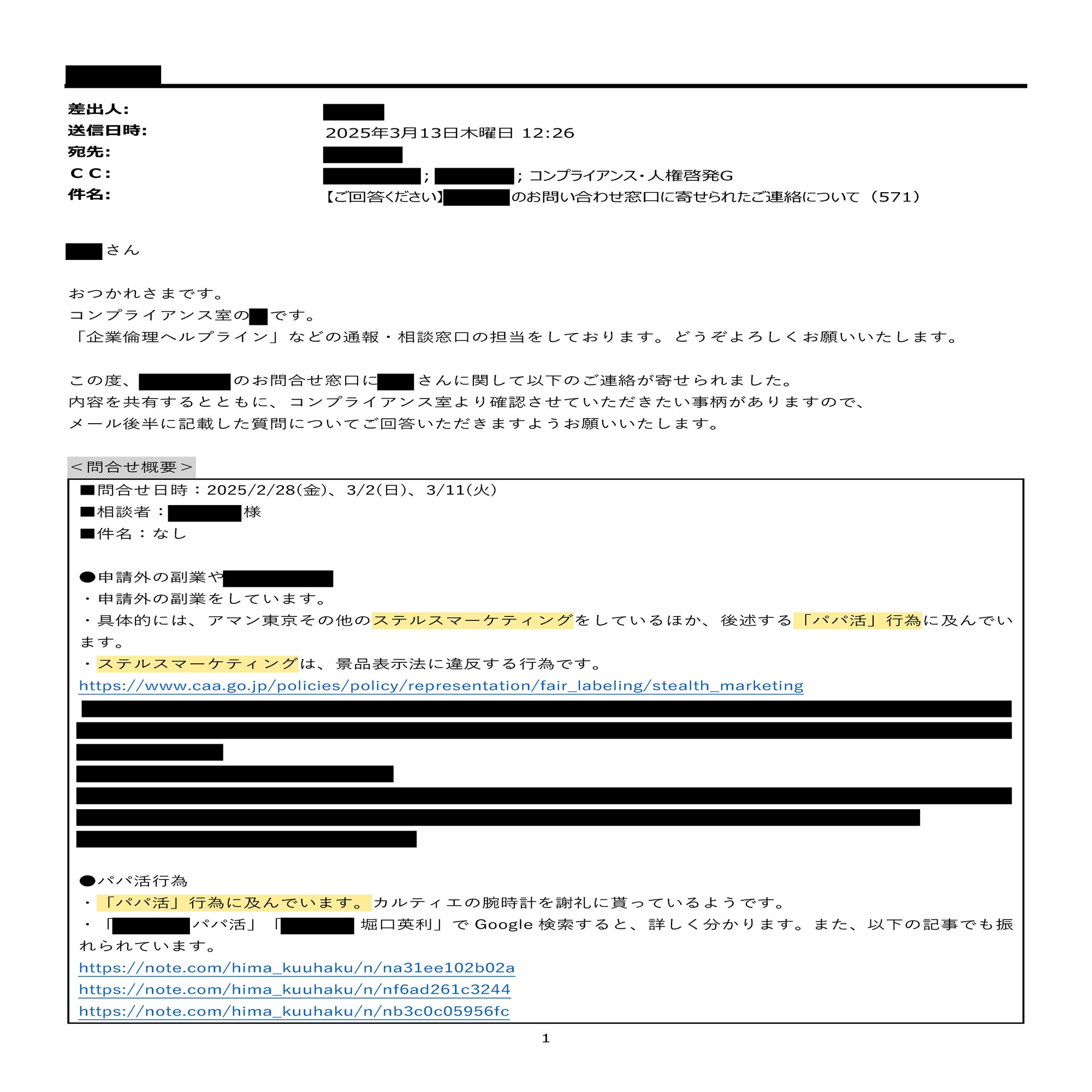 この発信者を名乗る人物によって、彼女は「会社に申請していない副業(ステルスマーケティングほか)をしている」「堀口英利とパパ活をしている」「この堀口英利は反社会的勢力およびカルト教団と関係がある」といった虚偽の内容を勤務先に通報されました。この際、この通報者は、被告人たる「暇空茜」こと水原清晃がWebサイト「note」に公開した投稿記事を通報の根拠としました。その他、この通報者は、上述の示談交渉について、事後的に「恐喝された」「高額な現金を脅し取られた」とも述べました。