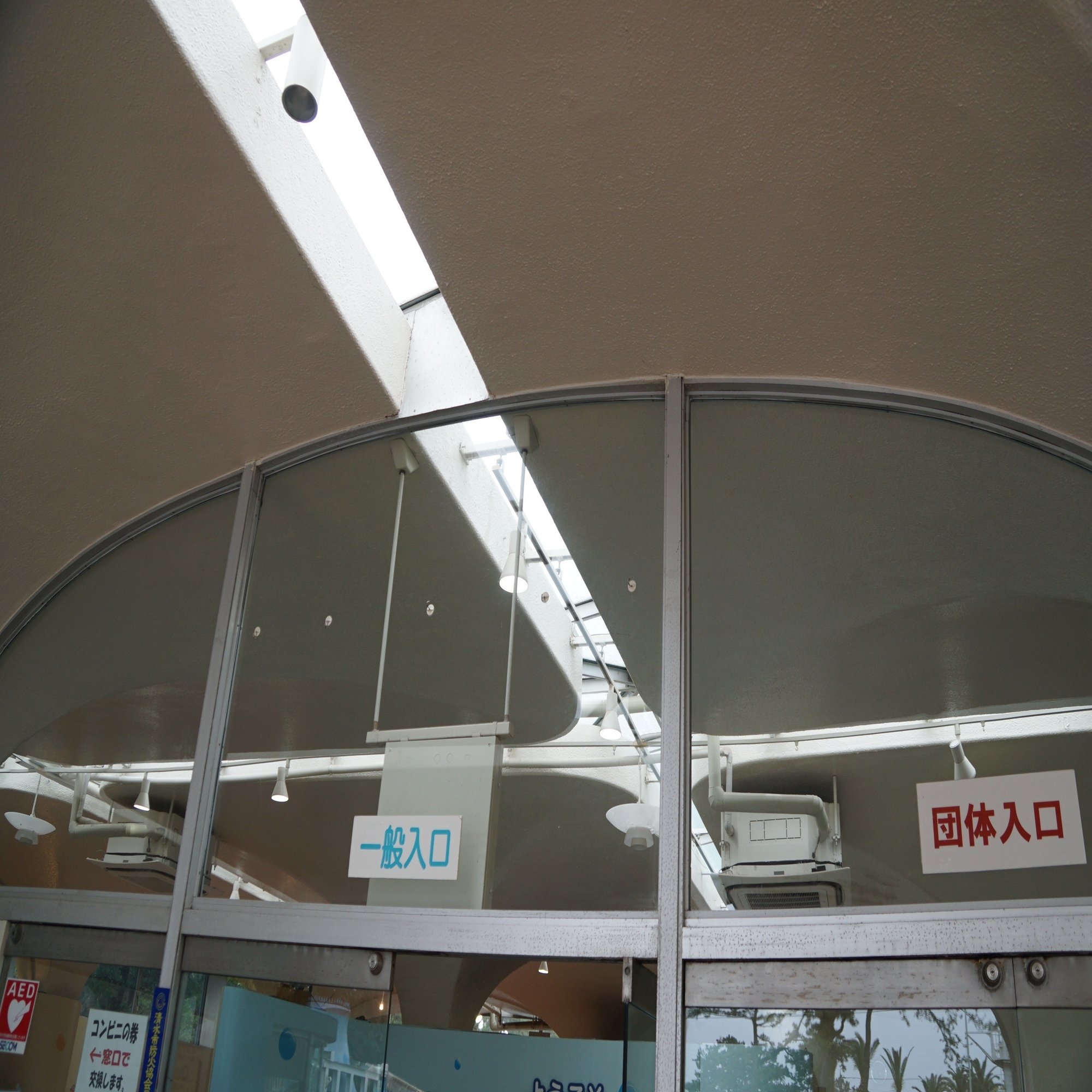 よく見るとモジュール化されている入り口部分の天井は建設当時は建築の未来を体現したものだったのでしょう。