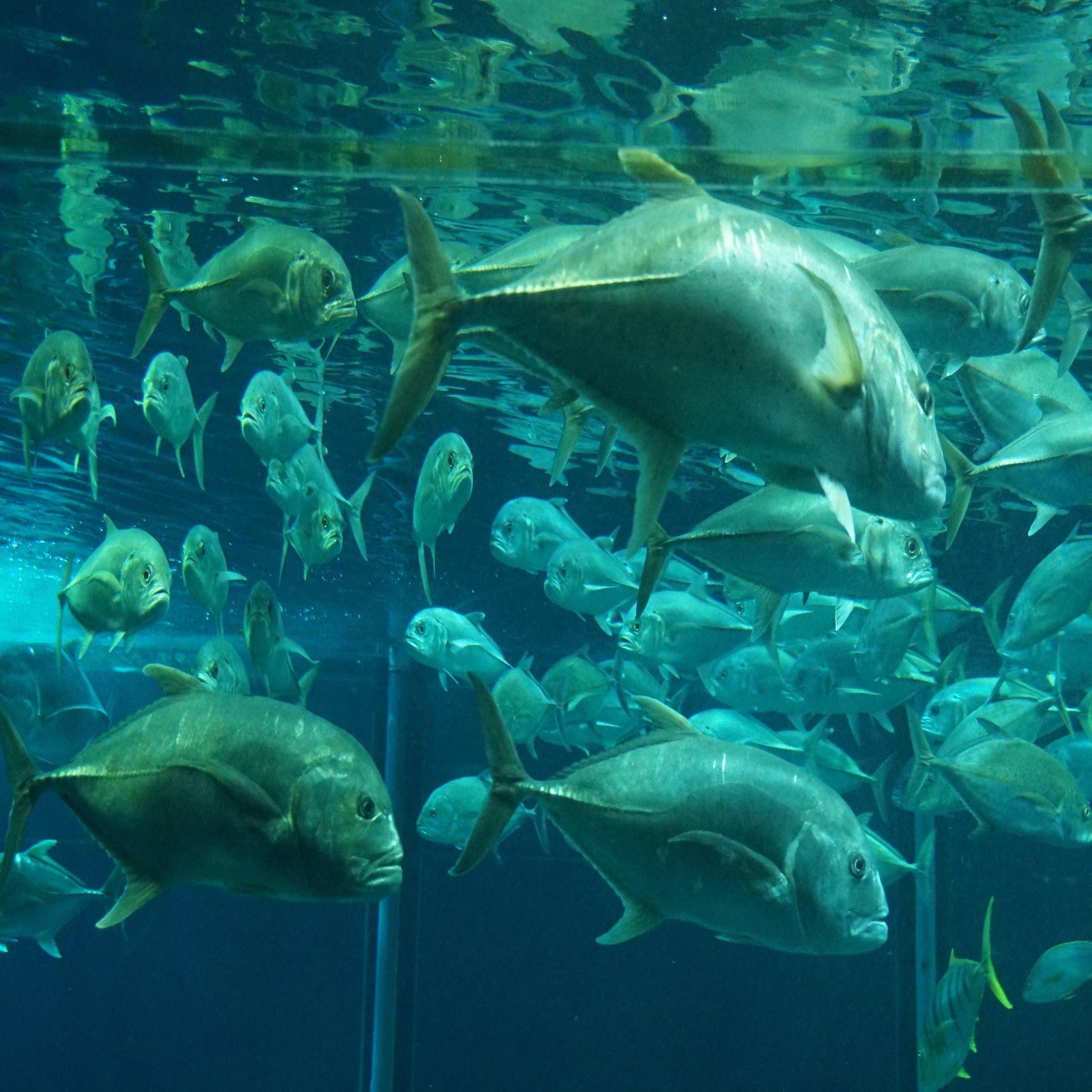 上のほうをテラスから見ることもでき、大型のアジの仲間が群れをなして渦巻いています。