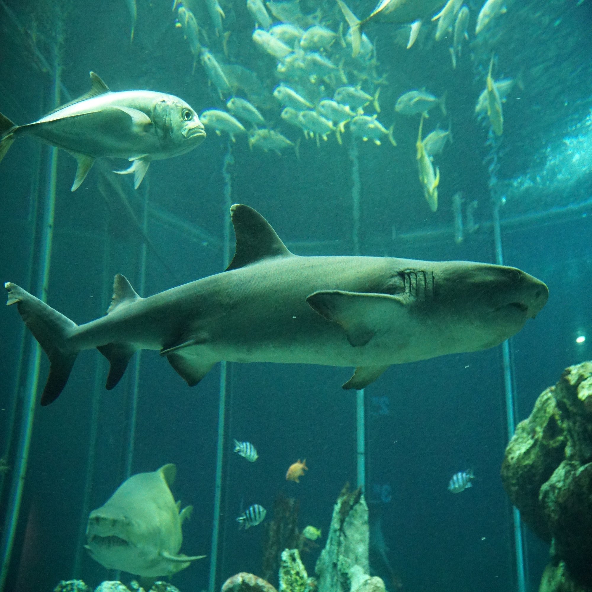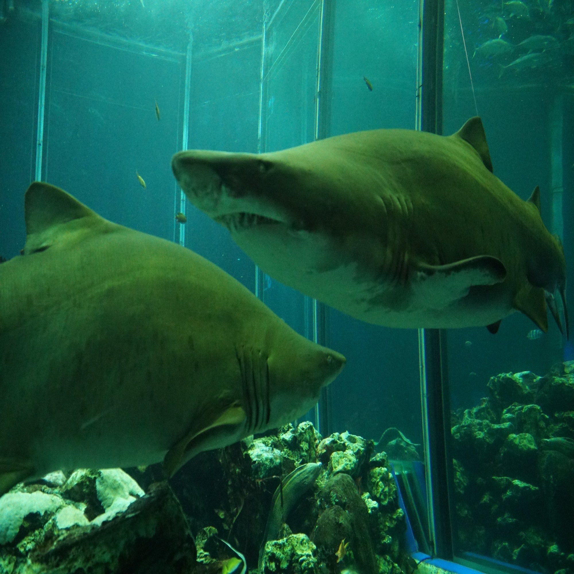 この水槽の主は2匹のどっしりとしたシロワニです。
