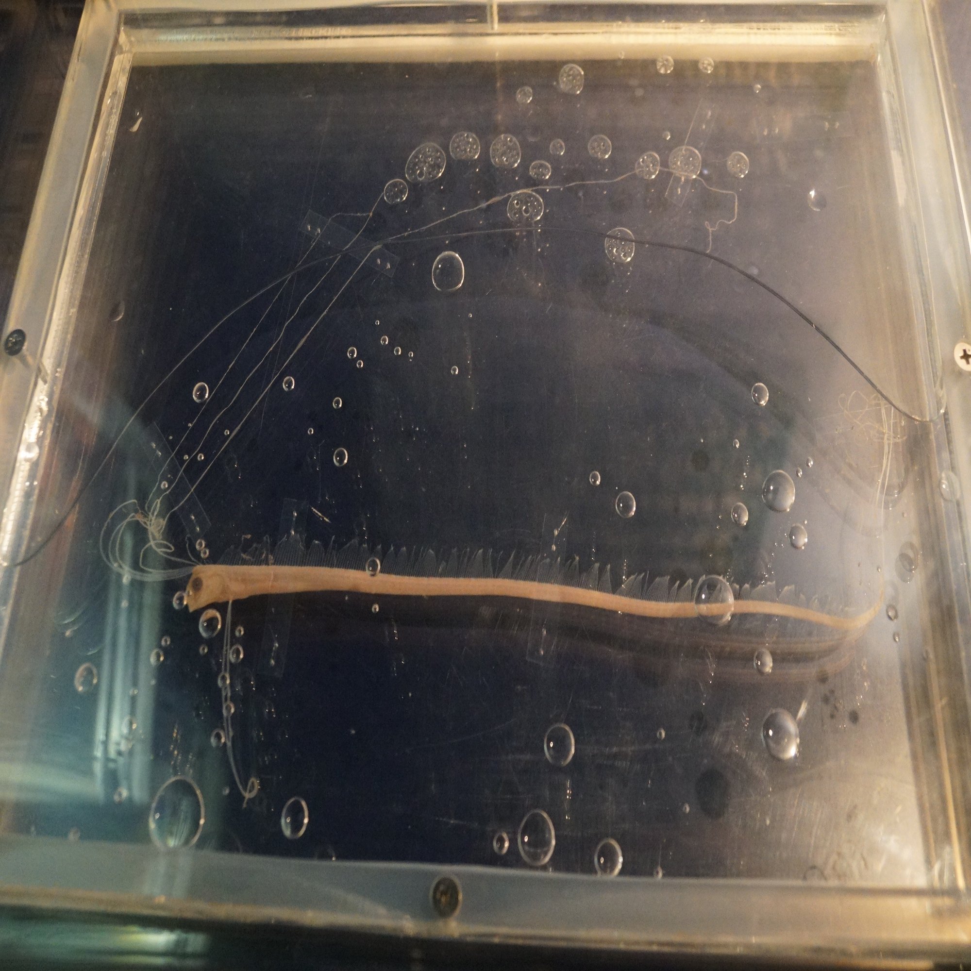 歯は餌であるプランクトンを摂るには使わないものの、上のオスのほうが発達していて、それはメスに離されないようかぶりつくのに良いからだと考えられているとのこと。しっかり確かめることができました。